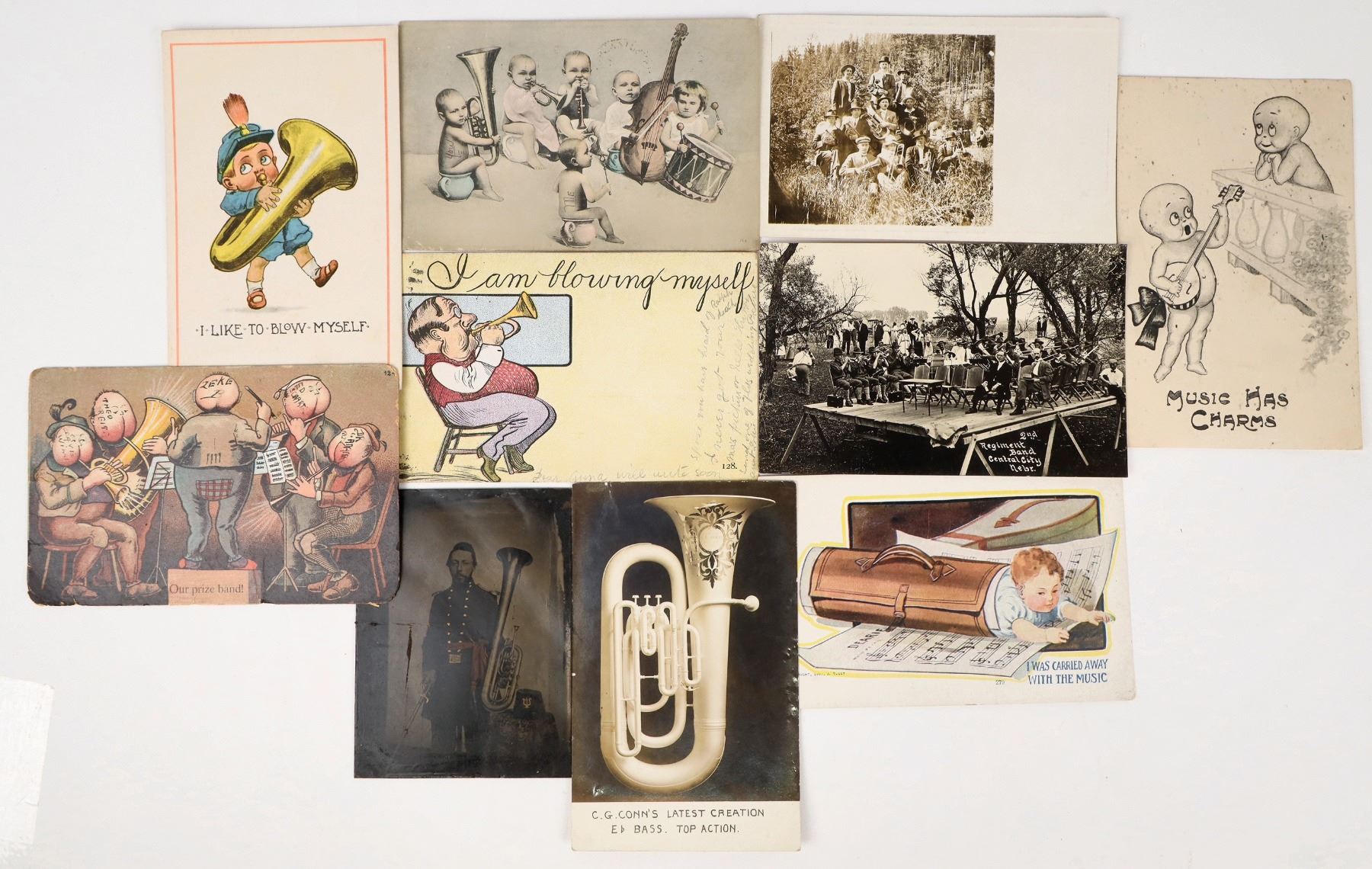 Lot of (10) music related ephemera items. Mainly photo post cards, consisting of instruments, clever word play cartoons, and (2) real photo posts cards of band groups. There is (1) metal photograph which appears to be a Civil War (or similar) musician with his instrument and sword proudly displayed. Please see photos.