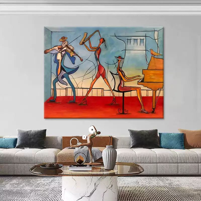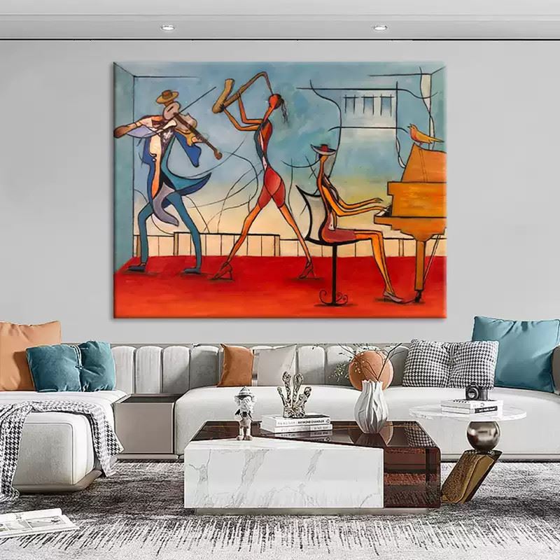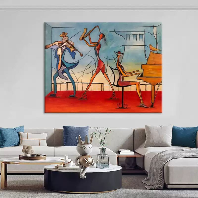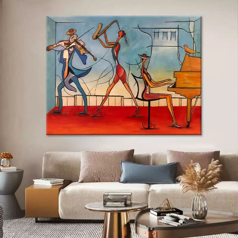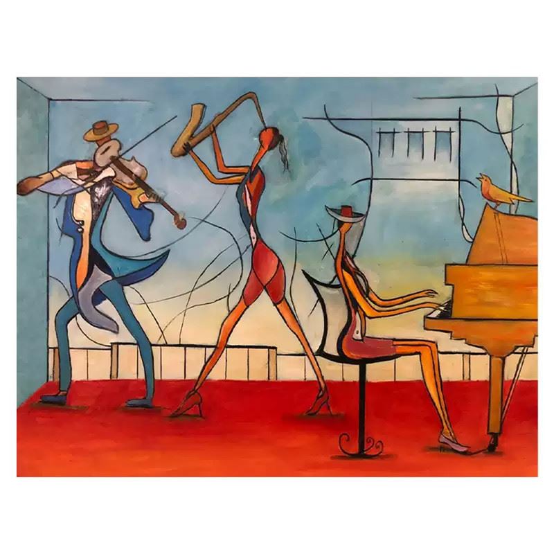 This vibrant artwork captures the energy and flow of a musical performance. The scene is alive with movement as three musicians, each playing a distinct instrument—violin, saxophone, and piano—bring the room to life. Their elongated forms and expressive poses highlight the passion and rhythm of their craft. The interplay of bright red, blue, and yellow tones creates a dynamic contrast, while a bird perched by the piano adds a touch of tranquility to the scene. The image beautifully merges abstraction with music, embodying a sense of unity through art. Dimensions: 31 x 24 inches.
