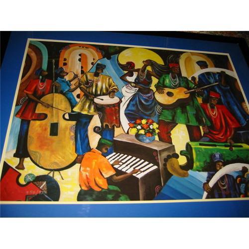 This Stunning and magnificent 34.5 by 42.5 inch art Lithograph has artist Cluidi A Okoye signature and is numbered. A limited edition of New Orleans Musical Scene with vibrant colors from 454 of 950. This art appears to be in excellent condition. It has eye catching gorgeous color of blule on black accented frame. It is breath taking and would make a wonderful decorative accent.