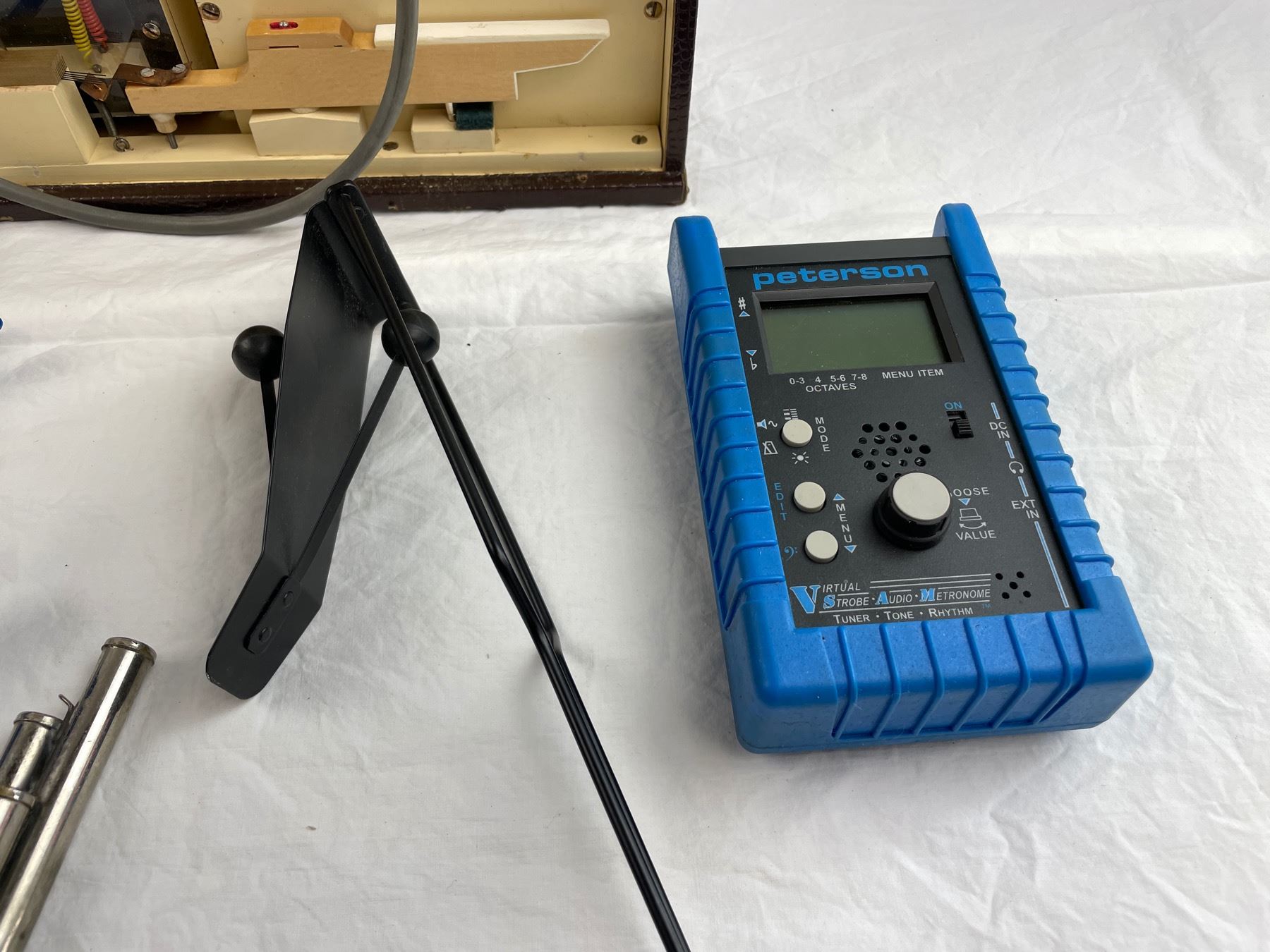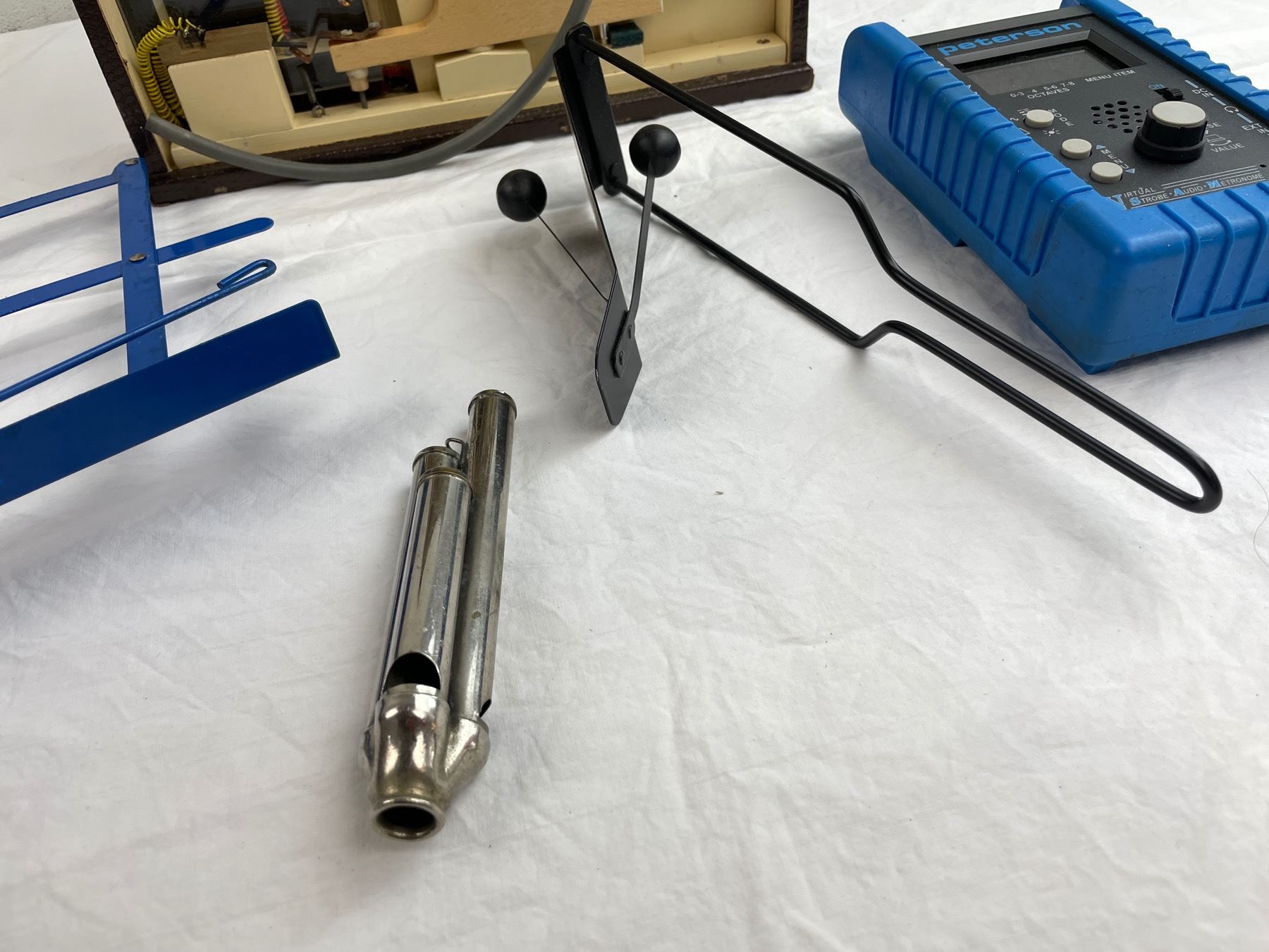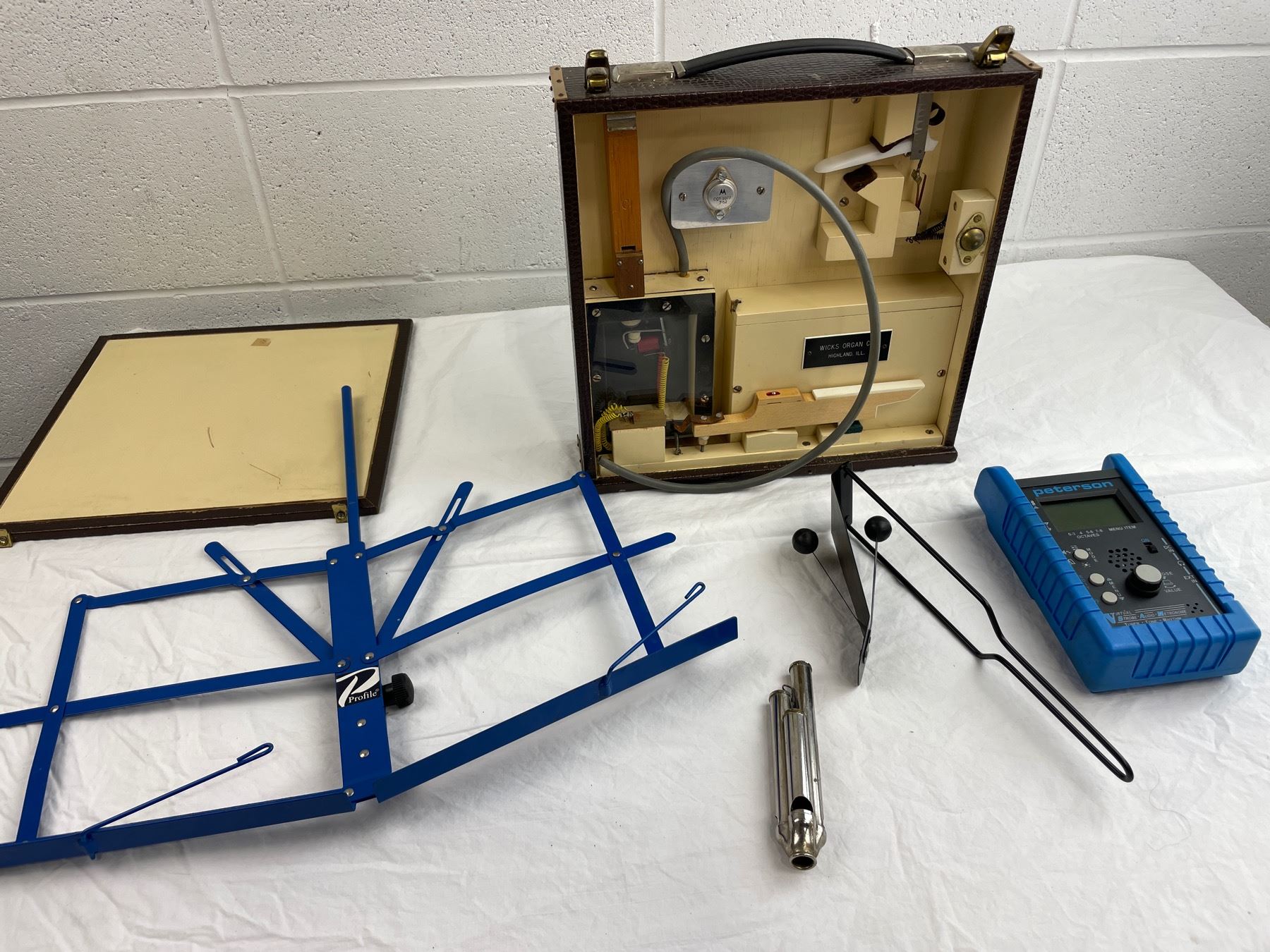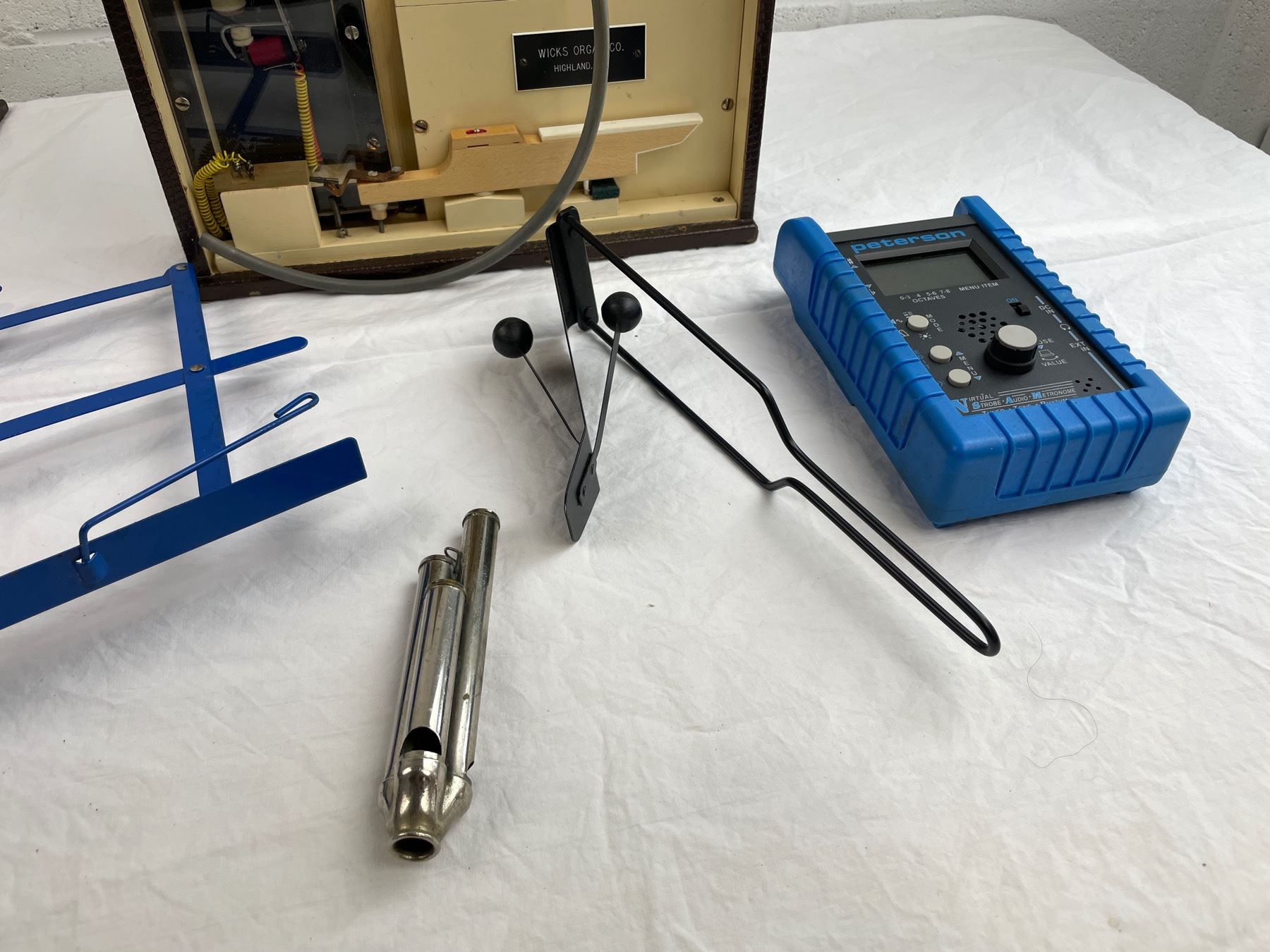 Including Peterson virtual strobe tuner (no cords), music stand, Wicks Organ Co. and Mid East Dobani Flexitone