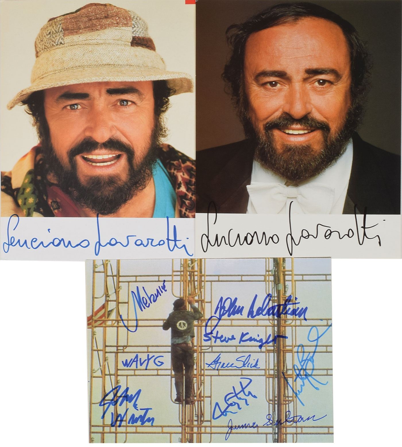 Seven photos signed by one or more musical artists, including: a pair of color cardstock close-up photos of Luciano Pavarotti, both approximately 8.25 x 11, signed in the lower borders in blue or black felt tip by the famed tenor; a limited edition glossy 10 x 12.5 photo of Martha & the Vandellas, numbered 230/300, signed in blue felt tip by Rosalind [Ashford] Holmes, Annette [Beard] Helton, and Martha Reeves, who adds "Love & God Bless, HoF 95"; two color satin-finish photos of Toby Keith, 11 x 14 and 14 x 11, both signed in black felt tip; a color glossy 10 x 8 photo of a rigger on the Woodstock stage scaffold, signed in blue felt tip by nine performers, including: Grace Slick, Melanie, John Sebastian, Johnny Winter, Wavy Gravy, Marty Balin, Juma Sultan, Tom Constanten, and Steve Knight; and a color satin-finish 11 x 14 photo of an artistic depiction of Bob Marley created with Jamaican colors and lyrics from his songs, signed in blue felt tip by Aston "Family Mon" Barrett, Junior Marvin, who adds "One love, 09," Al Anderson, and Lee "Jah" Perry. In overall fine condition.