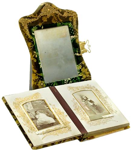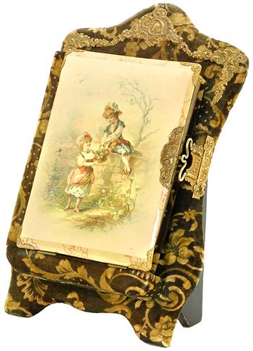 Musical Photograph Album, c. 1880 Extraordinary design in serpentine velvet-covered frame with lithographed cover dropping down to reveal a dressing-table mirror. With cylinder movement playing 2 airs. 17 in. high. - A superb collector's item!<Br>