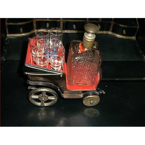 Musical Stage Coach Bar Set. It plays the song "How dry I Am" and it works great. It has a decanter with 6 shot glasses, 5 clear & 1 Blue. It is an older set, and has been used, but still a nice one to show or use. It is 14" L X 10" H X 5" W. As you take the bottle out to pour, the music comes on. Really cute one and will look good on any bar you have. Hope you like it. NICE SHOW PIECE ANYWHERE YOU PLACE IT. PLAYS "HOW DRY I AM". ENJOY