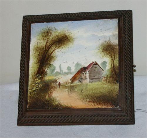 Musical Trivet. Wooden box on knobbed feet with tile insert depicting a country scene holds the musical mechanism which plays a polka. One foot has been replaced and does not match the other three. Approximately 10" square.