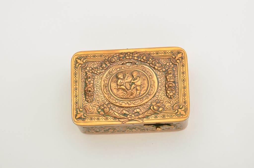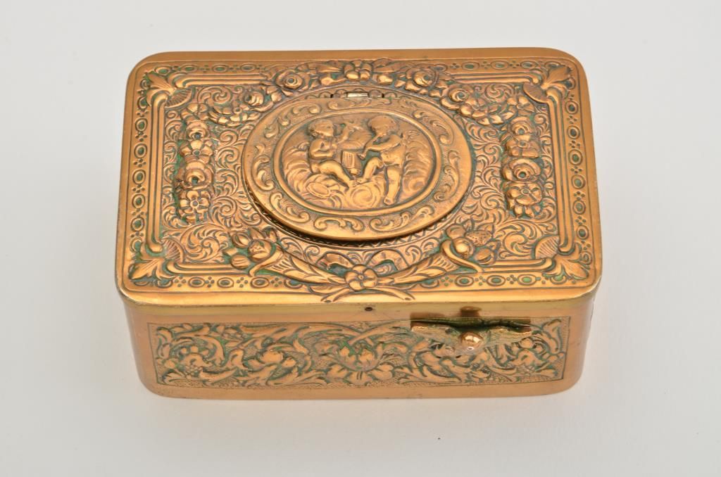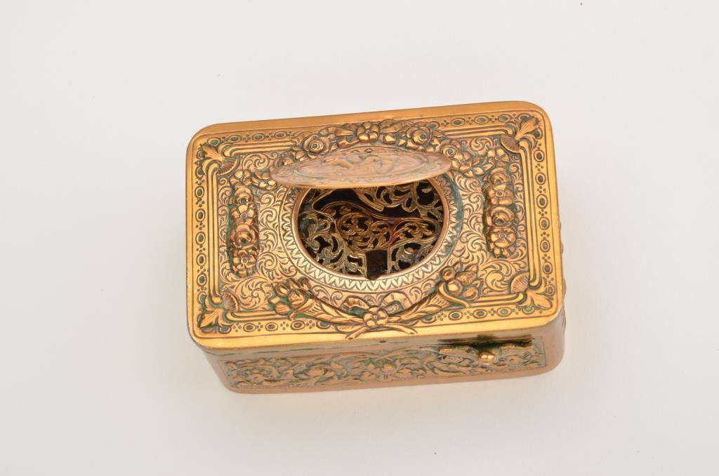 Musical bird box with fancy embossed and worked brass box showing small hall mark or maker’s mark, missing bird and parts – needs repair, 19th century. Est.: $200-$400.
