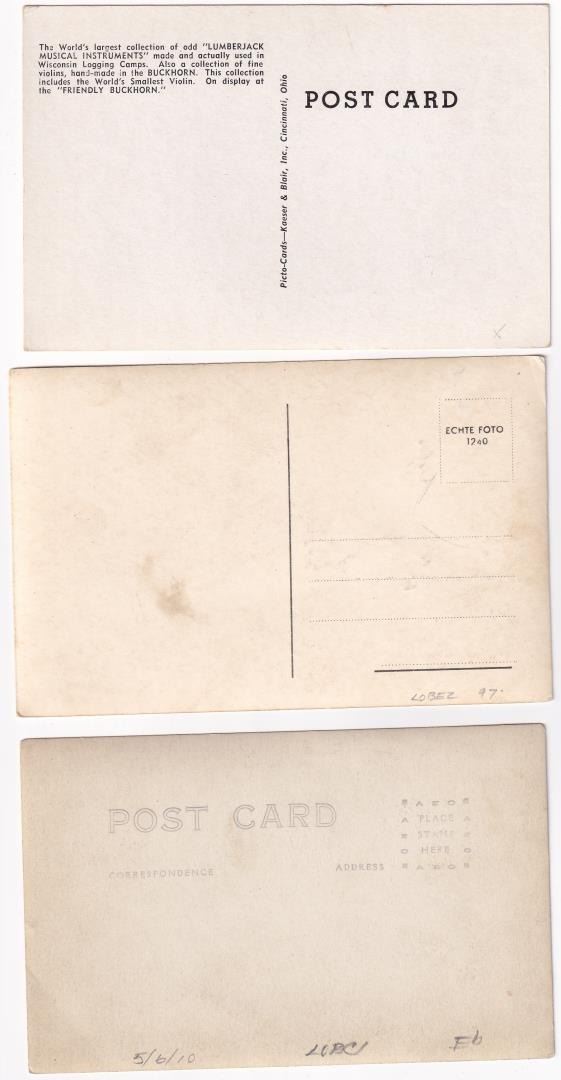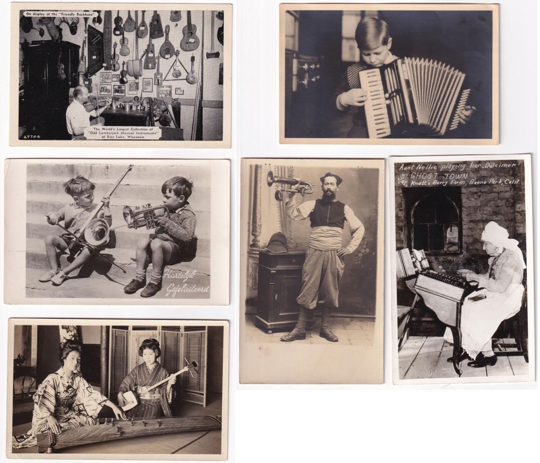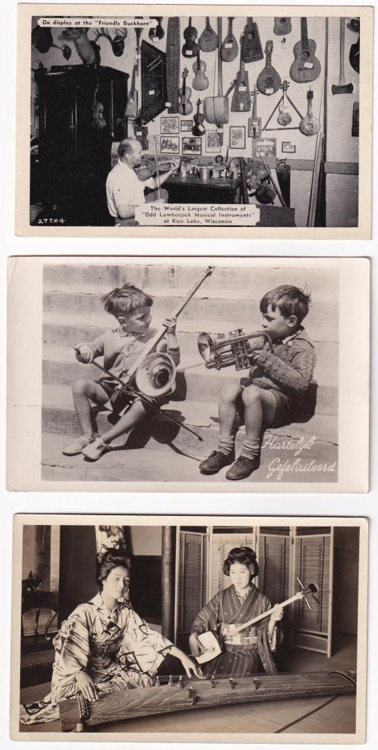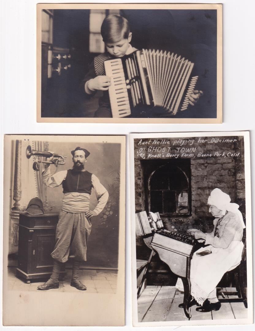 One photo displays the World's Largest Collection of Odd Lumberjack Musical Instruments in Rice Lake, Wisconsin. Another shows a person identified as Aunt Nellie playing a dulcimer in Ghost Town at Knott's Berry Farm, California.