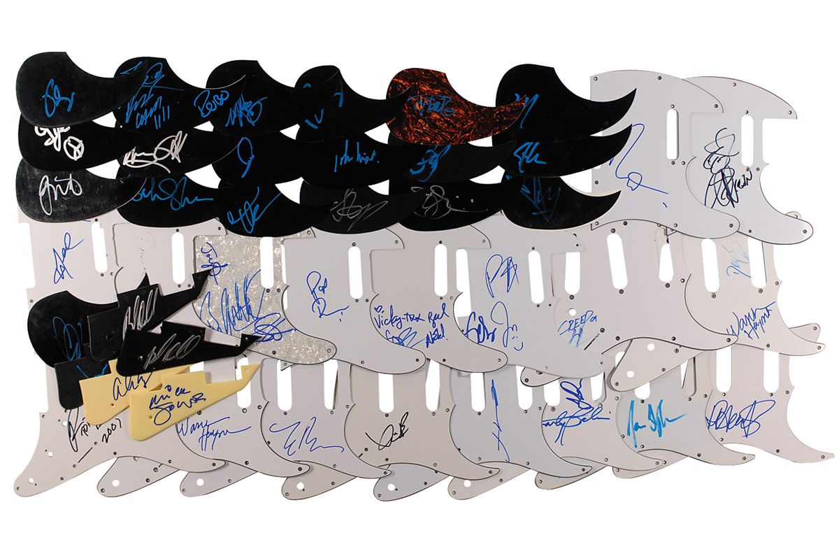 Forty-two pickguards for various models of electric and acoustic guitars, each signed in ink or felt tip by a different musician or celebrity. Signers are: Aerosmith, Allman Brothers, Brad Arnold (2), Kevin Bacon, Marty Balin and Jorma Kaukonen, Lindsey Buckingham, Tommy Chong, Bill Clinton (heavily faded), Cobra Starship, Alice Cooper, Chris Cornell, Ray Davies, Gavin Degraw, Paul Dianno, Fall Out Boy, Rob Halford, Warren Haynes, John Hiatt, Mark Hoppus, Joe Jonas, Mick Jones, Stefan Lessard, Adam Levine, Los Lonely Boys, Country Joe McDonald, The Misfits, Willie Nelson (2), Rick Nielson, Gavin Rossdale, Todd Rundgren, Joe Satriani, Sarah Silverman, Scott Strapp, James Taylor (2), Rob Thomas, John Travolta, Steven Tyler (2), and Pete Wentz.In fine overall condition.