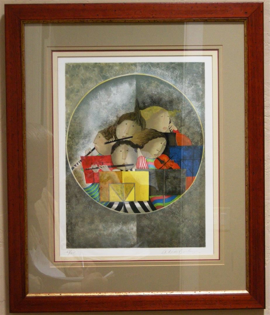 A whimsical ensemble of three flutists and two string musicians are engrossed in their performance, painted by G.R. Boulanger. The lithograph on paper, edition #23/200, measures 23.625 x 12; framed image measures approx. 31 x 26.