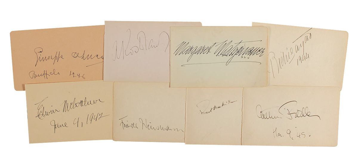 Vintage ink signatures of 14 conductors and singers on both sides of eight 6 x 4 album pages. Signers include: Andre Kostelanetz, Enya Gonzalez, Arthur Fiedler, Giuseppe Bamboschek, Ernest Macmillan, Frieder Weissmann, Nan Merriman, Edwin McArthur, Bidu Sayao, Richard Tucker, Giuseppe de Lucca, and Margaret Matzenauer. In fine overall condition.