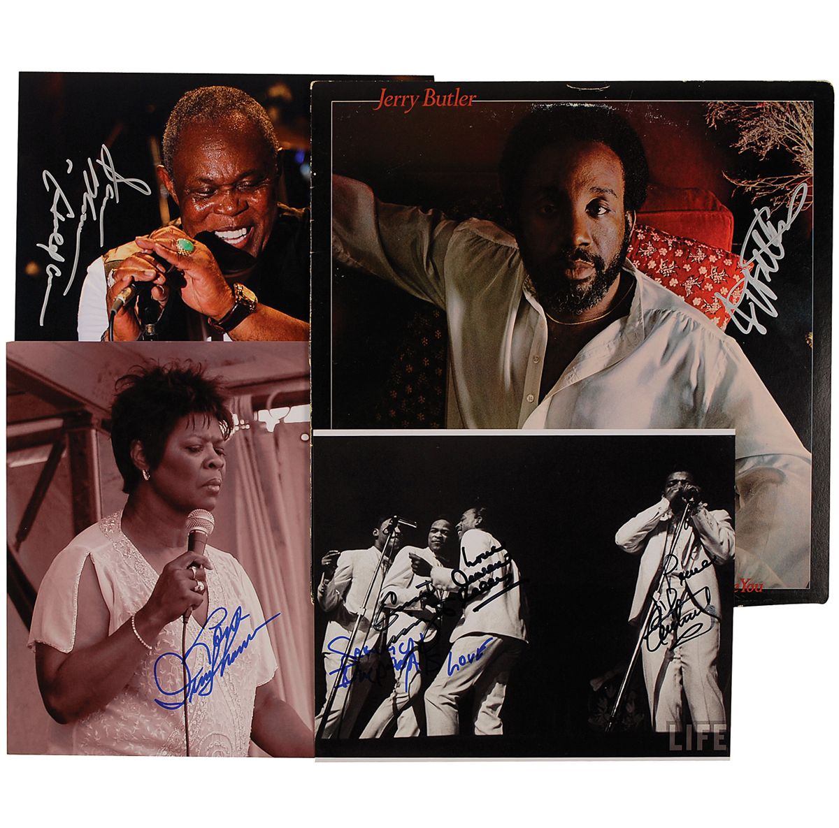 Four items: glossy and satin-finish 8 x 10 and 10 x 8 photos, each signed in ink or felt tip by the respective musician(s) pictured: Irma Thomas, Sam Moore, and Little Anthony and the Imperials; and Nothing Says I Love You Like I Love You album, signed on the front cover in silver ink by Jerry Butler. The record is included. In fine condition, with scattered light edge and cover wear to album.