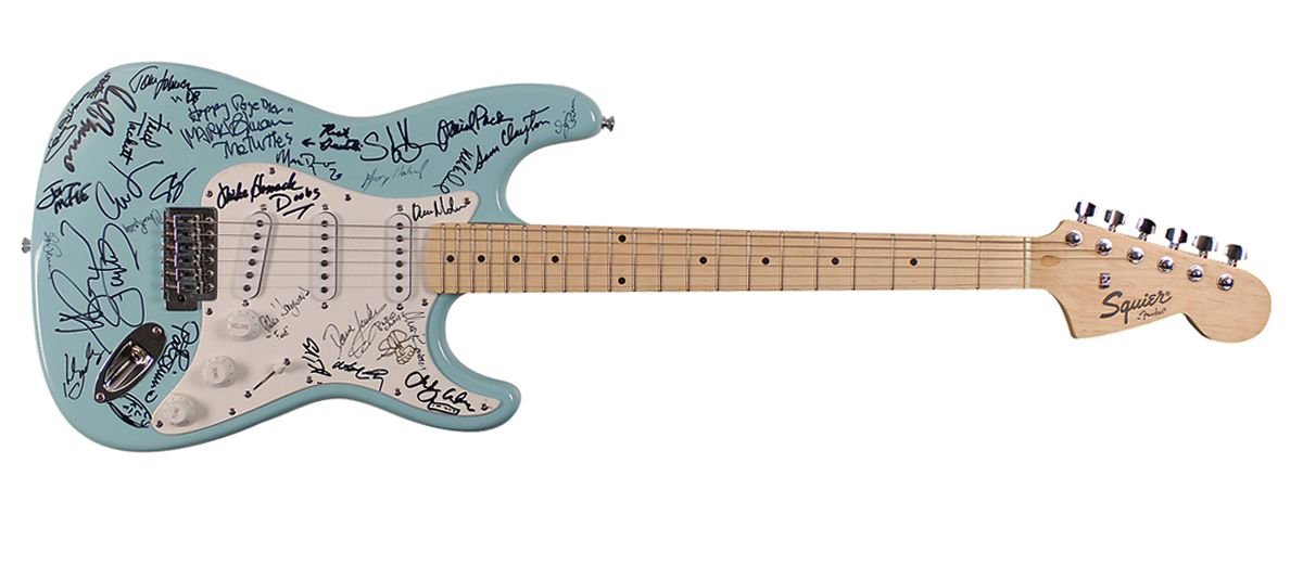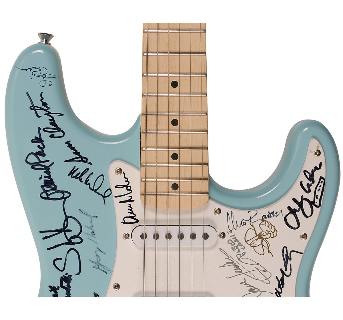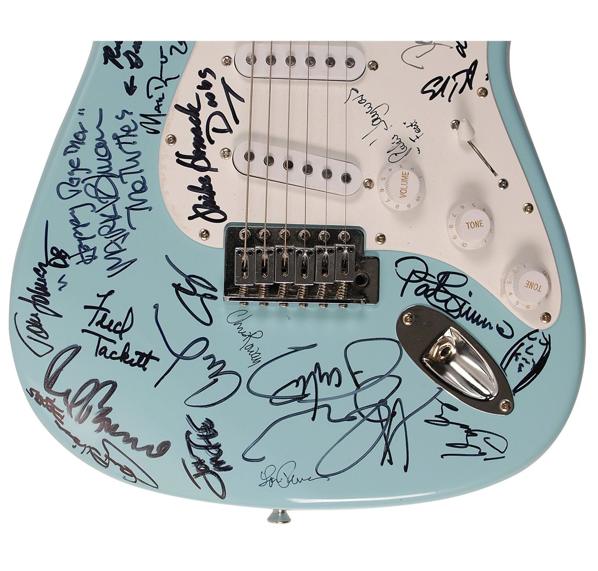 Light blue-bodied Fender Squier ‘stratocaster-style’ electric guitar, signed on the body and white pickguard in felt tip and ink by over 20 musicians, including Mark Volman and Howard Kaylan of The Turtles; Mike Hossack, Tom Johnston, Pat Simmons, Michael McDonald, and Guy Allison of the Doobie Brothers; Little Feat’s Sam Clayton, Richie Hayward, Fred Tackett, and Shaun Murphy; Chris Rowan (2); David Pack; and Pablo Cruise’s David Jenkins, Steve Price, and Cory Lerios. In fine condition, with some irregular adhesion to a couple of signatures. Oversized.