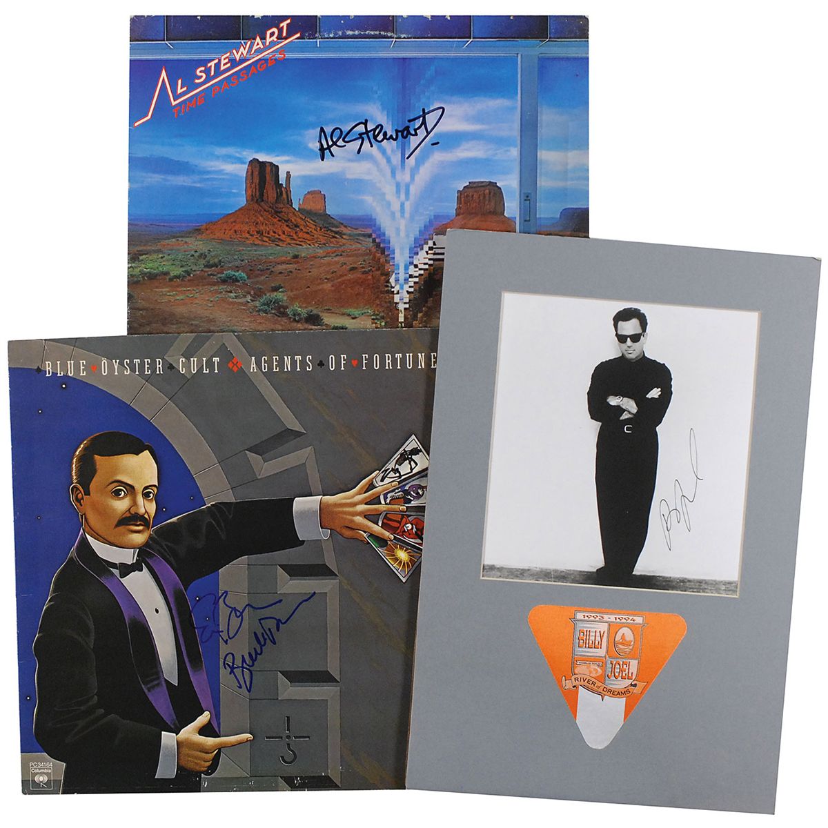 Three items: Agents of Fortune album, signed on the front cover in blue felt tip by Blue Oyster Cult’s Eric Bloom and Buck Dharma; Time Passages album signed on the front cover in black felt tip by Al Stewart; and a glossy 7 x 7.5 photo of Billy Joel, signed in gold ink, and matted with a River of Dreams tour pass to an overall size of 10 x 15. The records are included. In overall fine condition.
