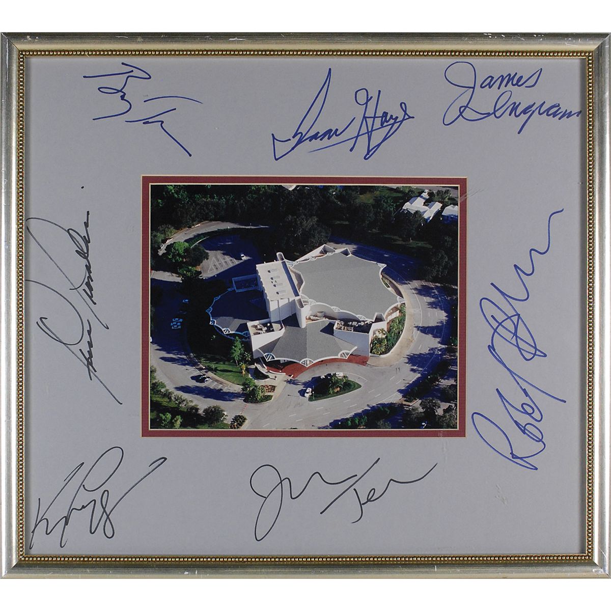 Color 9.5 x 7.75 aerial photo of a large building, somehow related to Tampa Bay Florida’s WQYK Country radio station, double-matted to a size of 17.5 x 15.5, signed on the mat in blue and black felt tip by seven musicians: Robert Palmer, Kenny Loggins, James Ingram, Isaac Hayes, John Tesh, Boney James, and Fred Travalena. Framed to an overall size of 19.25 x 17.25. In fine condition. Three of the signers, Palmer, Hayes, and Travalena, are now deceased.