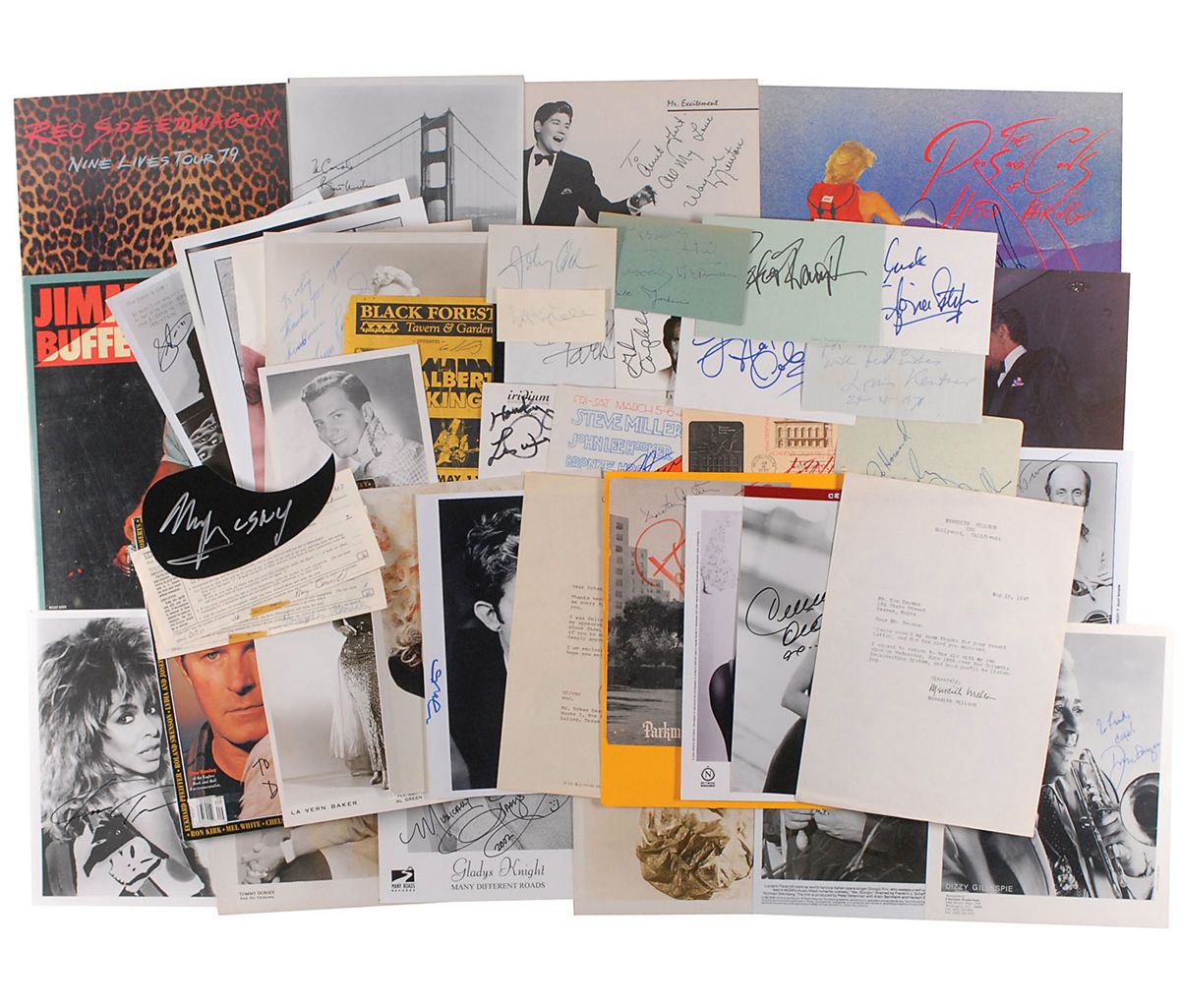 Collection of 49 items consisting primarily of signed photos and signatures, with a few other formats including documents and albums, each signed in ink or felt tip by the musician(s) pictured, with most inscribed. Signers are: LaVern Baker, Tony Bennett, Pat Boone, Jimmy Buffet, Sammy Cahn, Glen Campbell (2), Johnny Cash, Kenny Chesney, Rosemary Clooney, Joe Cocker, Nat King Cole, Natalie Cole, Ray Conniff, David Crosby, Celine Dion, Fats Domino, Tommy Dorsey, Billy Eckstine, Gloria Estefan, Peter Frampton, Dizzy Gillespie, Patty Hearst, Don Henley, Woody Herman, Louis Kentner, Albert King, Gladys Knight, Frances Langford, Avril Lavigne, Peggy Lee, Jerry Lee Lewis, Loretta Lynn, Glenn Miller, Steve Miller, Grace Moore, Wayne Newton, Colonel Tom Parker, Dolly Parton, Les Paul, Luciano Pavarotti, Peter, Paul, and Mary, REO Speedwagon, Steely Dan (Fagan and Becker), Tina Turner, Tom Waits, Roger Waters, Keith Whitley, and Meredith Willson. In overall very good to fine condition.