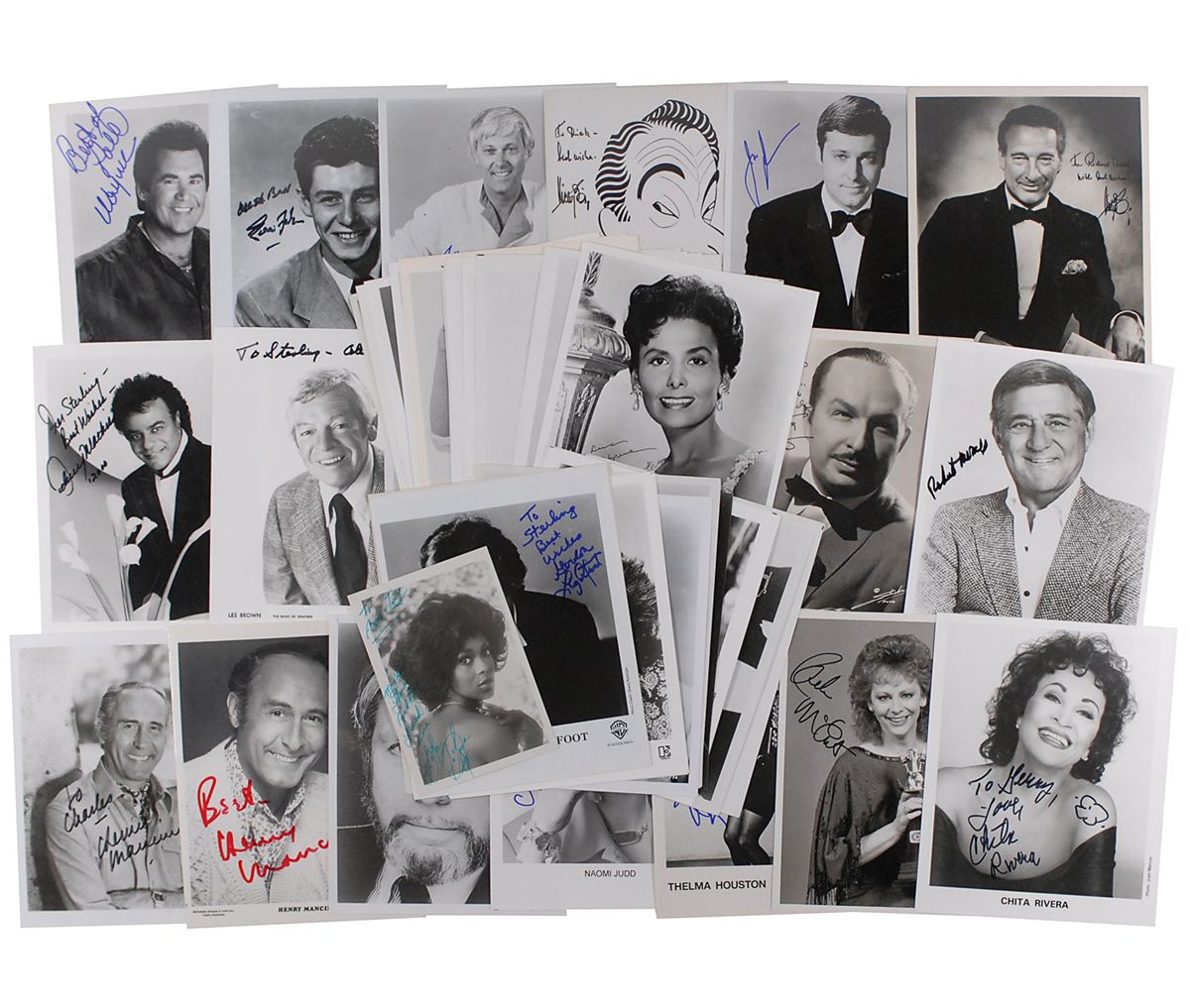 Collection of 49 photos, almost all 8 x 10, various finishes, each signed in ink or felt tip by the performer pictured, with several inscribed. Signers include: Shirley Bassey, Theodore Bikel, Sonny Bono, Victor Borge (2), Teresa Brewer (2), Les Brown, Carol Conners, Michael Crawford (2), Xavier Cugat, Vic Damone, Charlie Daniels, Lola Falana, Freddy Fender, Eddie Fisher, Lesley Gore, Horace Heidt, Lena Horne (2), Thelma Houston, Naomi Judd, Evelyn ‘Champagne’ King, Gladys Knight (2), Gordon Lightfoot, Henry Mancini (2), Johnny Mathis, Reba McEntire, Robert Merrill, Wayne Newton, Tony Orlando, Patti Page, Helen Reddy (2), Chita Rivera, Bobby Rydell (2), Bobby Sherman, Bobby Short, Frank Sinatra, Jr., Conway Twitty, and Leslie Uggams (2). In fine condition.