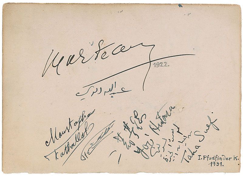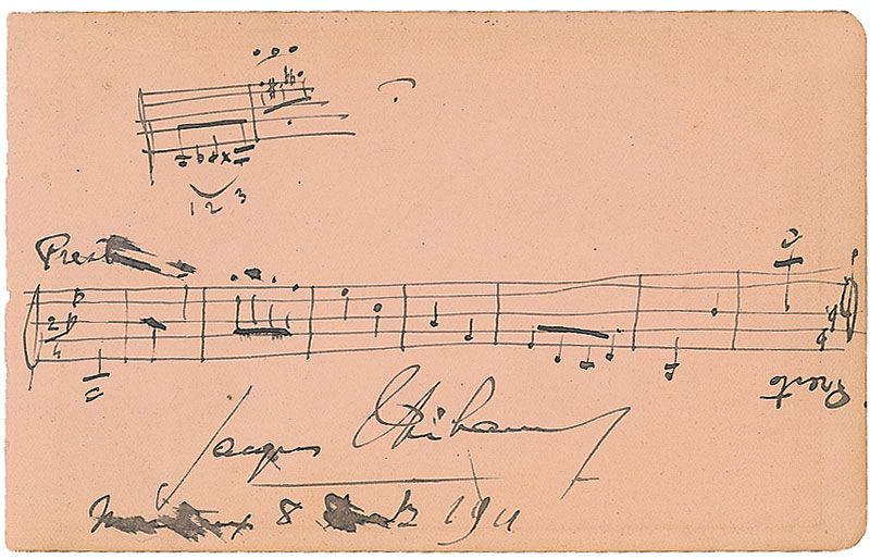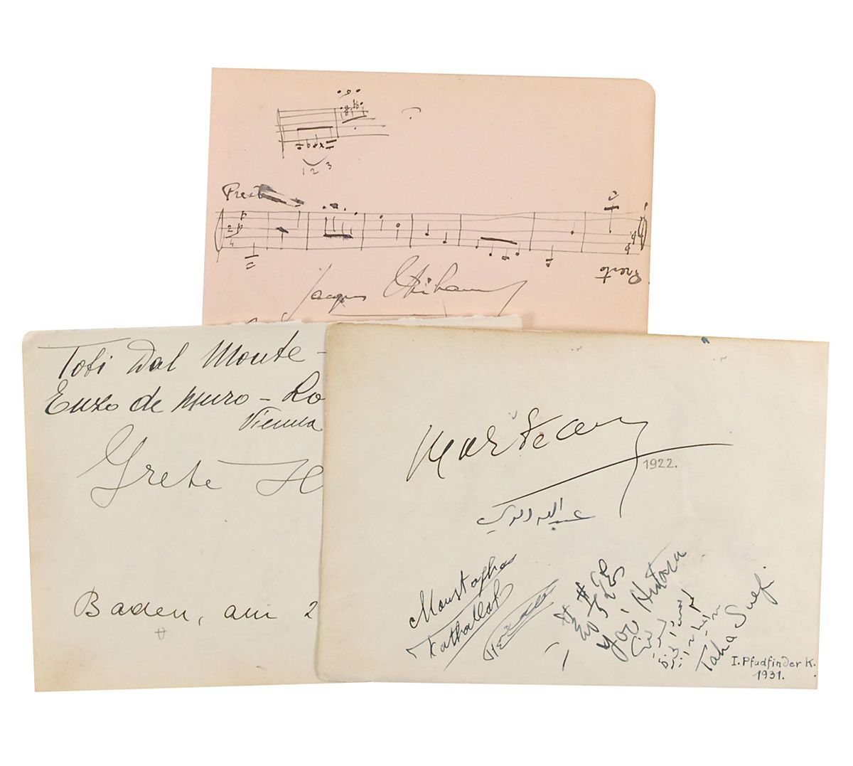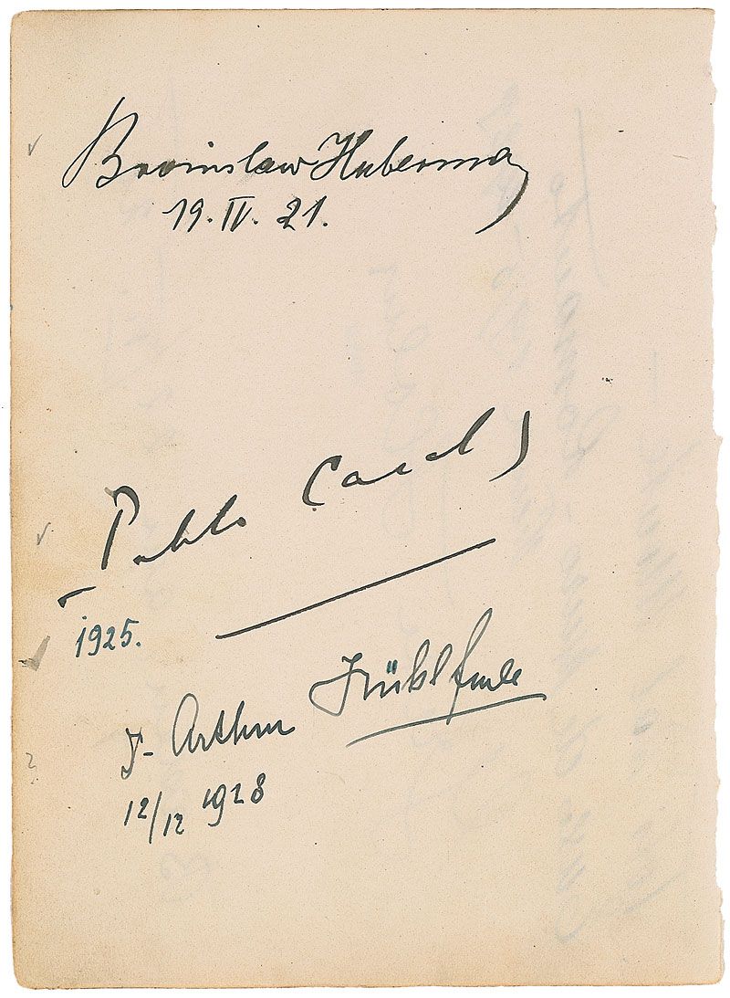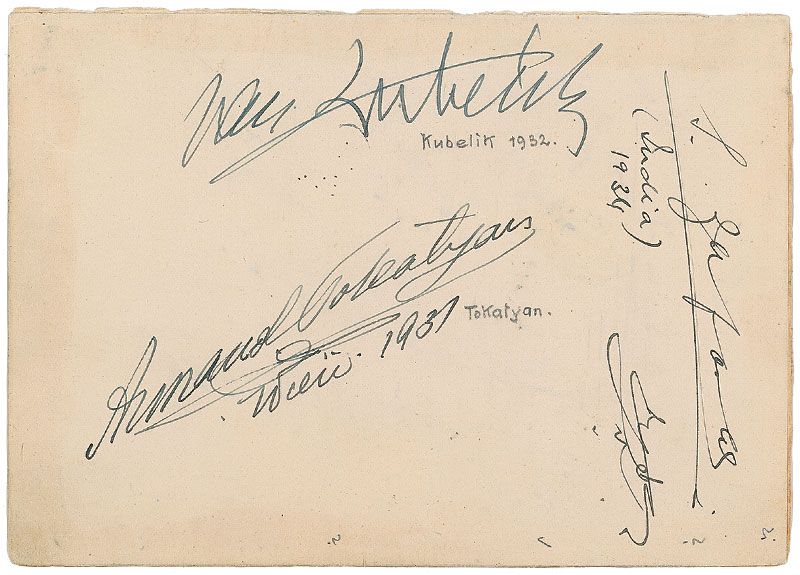Ink signatures of eight musicians on three various size album pages. First page bears an AMQS from Jacques Thibault, who pens eight bars from ‘Presto,’ ingeniously written to be read the same way, either right side up or upside down, adding a smaller two bar quote to the top left; signatures of cellist Pablo Casals, violinist Bronislaw Huberman, soprano Toti Dal Monte and her husband tenor Enzo de Muro-Lomanato, and soprano Grete Holm; and violinist Jan Kubelik and tenor Armand Tokatyan, along with four others on the third page. In fine condition, with some scattered light toning and soiling.