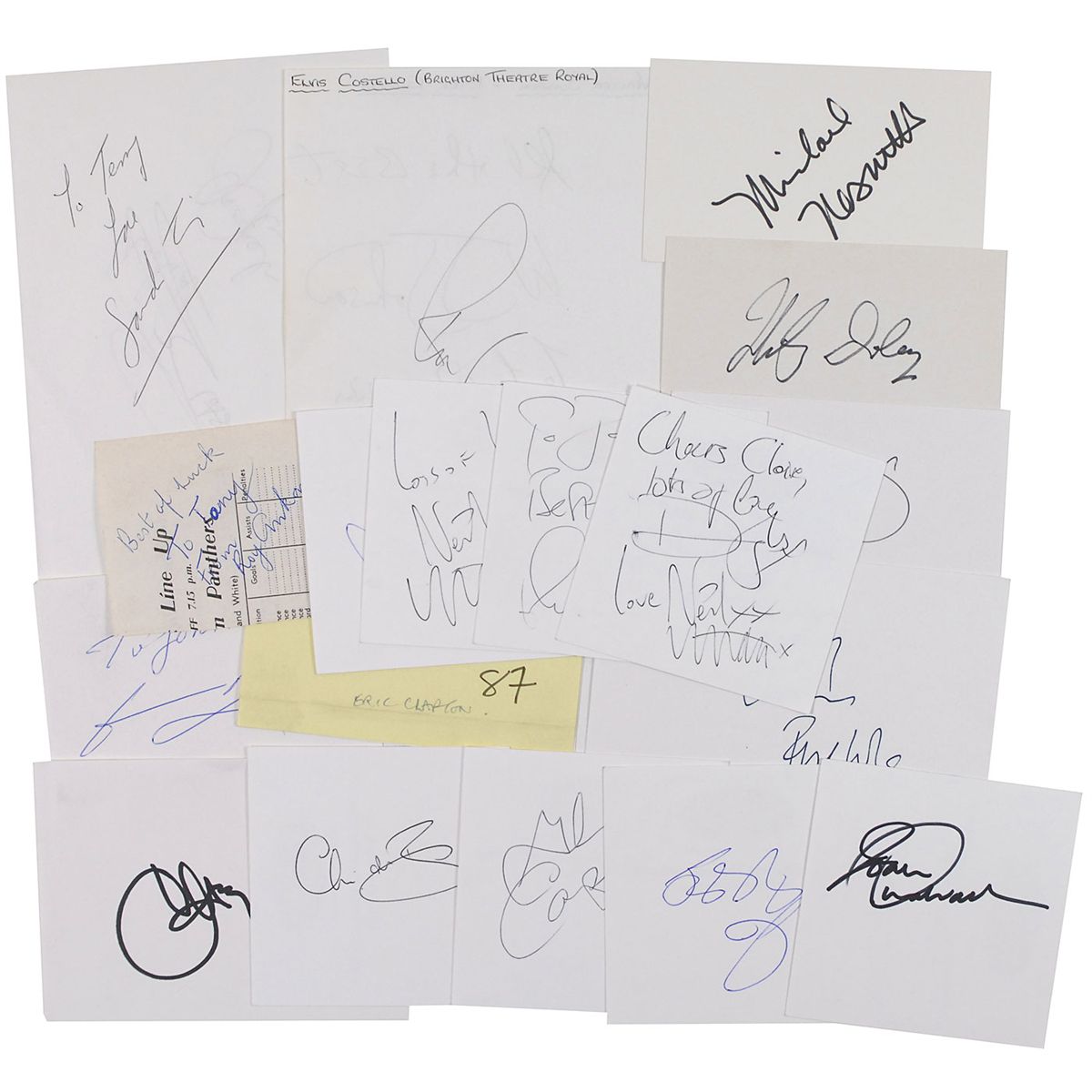 Collection of 18 ink and felt tip signatures on various size cards and slips, many inscribed. Signers include: Eric Clapton, David Jones, Mickey Dolenz, Mike Nesmith, Phil Collins, David Essex, Elvis Costello, Joan Armatrading, Glen Campbell, Patti Smith, Cher, and members of Travis. In fine condition.