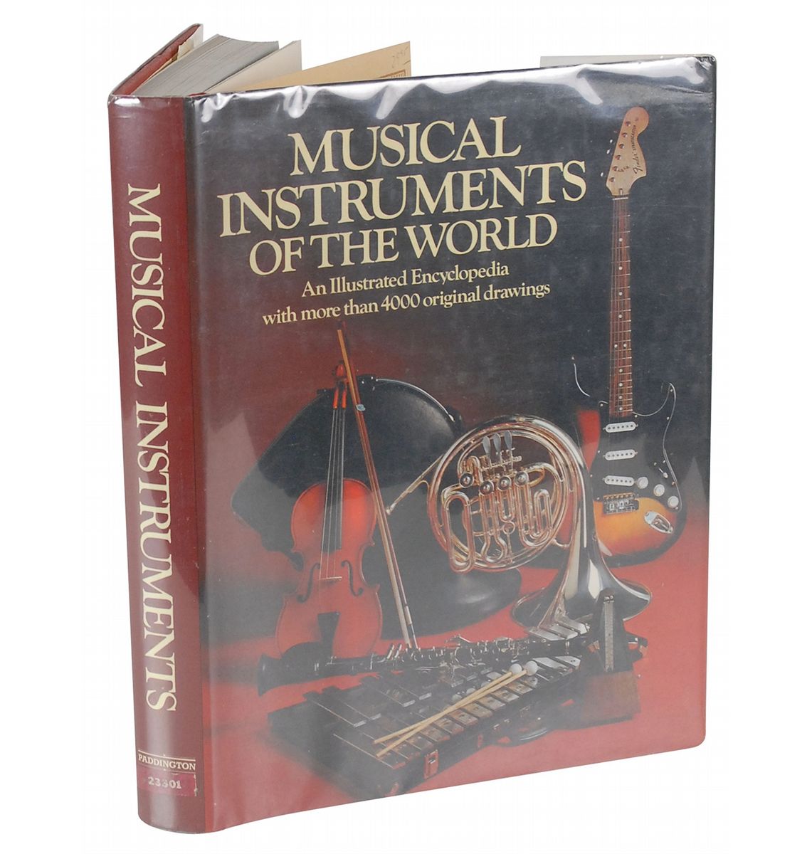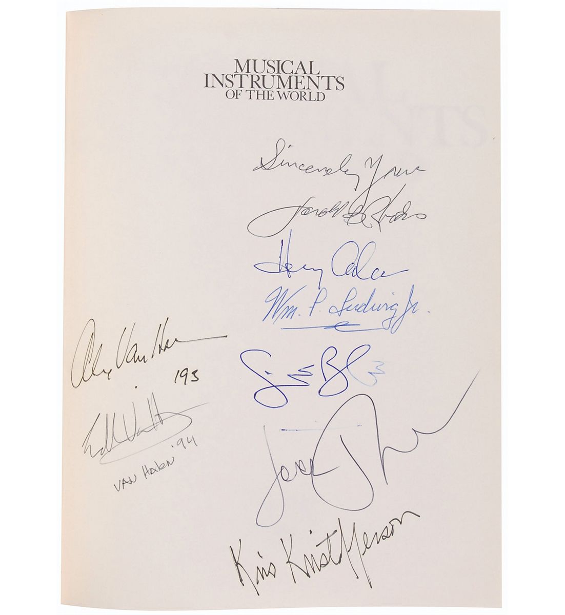 Signed book: Musical Instruments of the World. U.K.: Paddington Press, 1976. Hardcover with dust jacket, 8.75 x 11.25, 320 pages. Signed in ink on the half title page by Eddie Van Halen, Alex Van Halen, Ginger Baker, Jack Bruce, William Ludwig (owner of the Ludwig Drum Company), Harold Rhodes (inventor of the Rhodes piano), Henry Adler (Buddy Rich’s drum teacher), and Kris Kristofferson. Autographic condition: Fine. Book condition: VG+/VG.