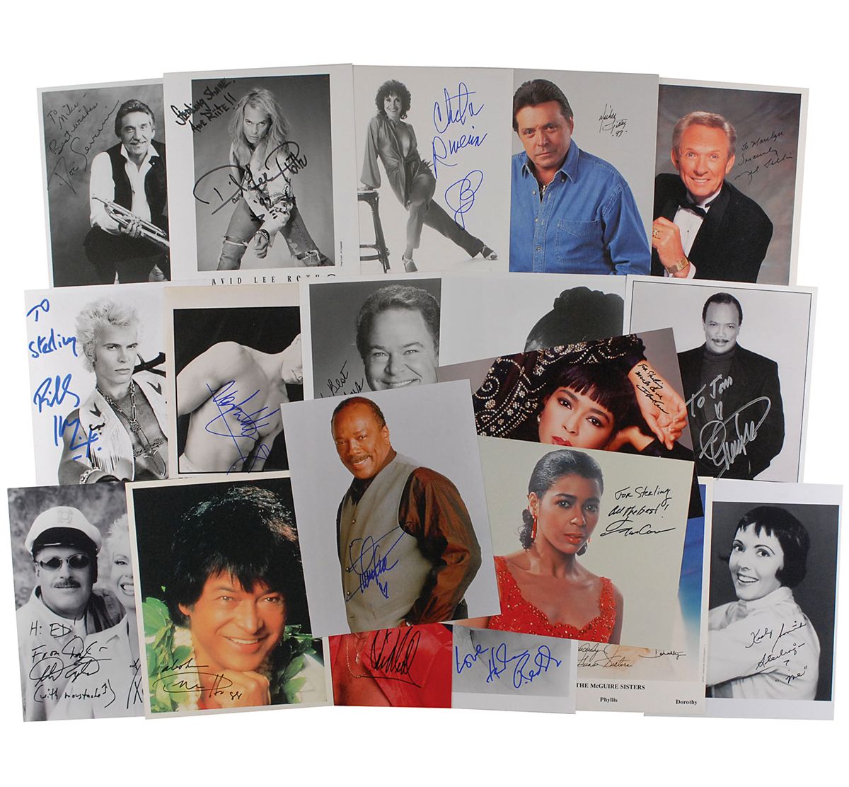 Collection of 19 signed photos, each signed in ink or felt tip by the musician pictured. Signers are: Pearl Bailey, Captain and Tennille (ins), Irene Cara (2 ins), Roy Clark, Mickey Gilley, Don Ho, Billy Idol (ins), Quincy Jones (2, 1 ins), Marky Mark, The McGuire Sisters (ins), Bill Medley, Helen Reddy, Chita Rivera, David Lee Roth (ins), Doc Severinsen (ins), Keely Smith, and Mel Tillis (ins). In fine condition.