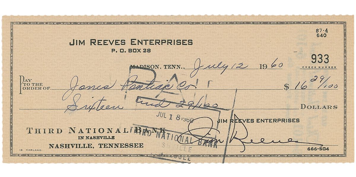 Collection of three personal and business checks, each signed by a different musician. Signers are: Jim Reeves, Conway Twitty, and Mel Torme. In fine condition, with expected stamps, lightly affecting a couple of the signatures.