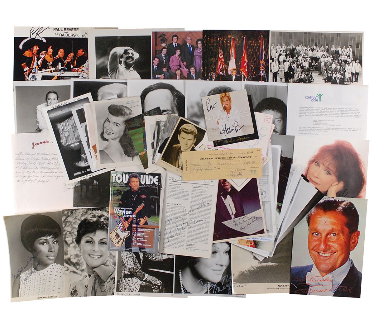 Collection of approximately 75 items, including photos, programs, signatures, and letters, each signed by a musician, including: Van Cliburn, Waylon Jennings, Sammy Cahn, Connie Stevens, Don Ho, Barry Manilow, Dionne Warwick, Andy Williams (3), Diahann Carroll, Roy Clark, Mitch Miller, Henry Mancini, Dinah Shore, Joan Sutherland, and Marvin Hamlisch. In overall very good to fine condition.