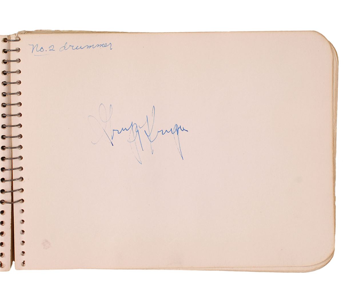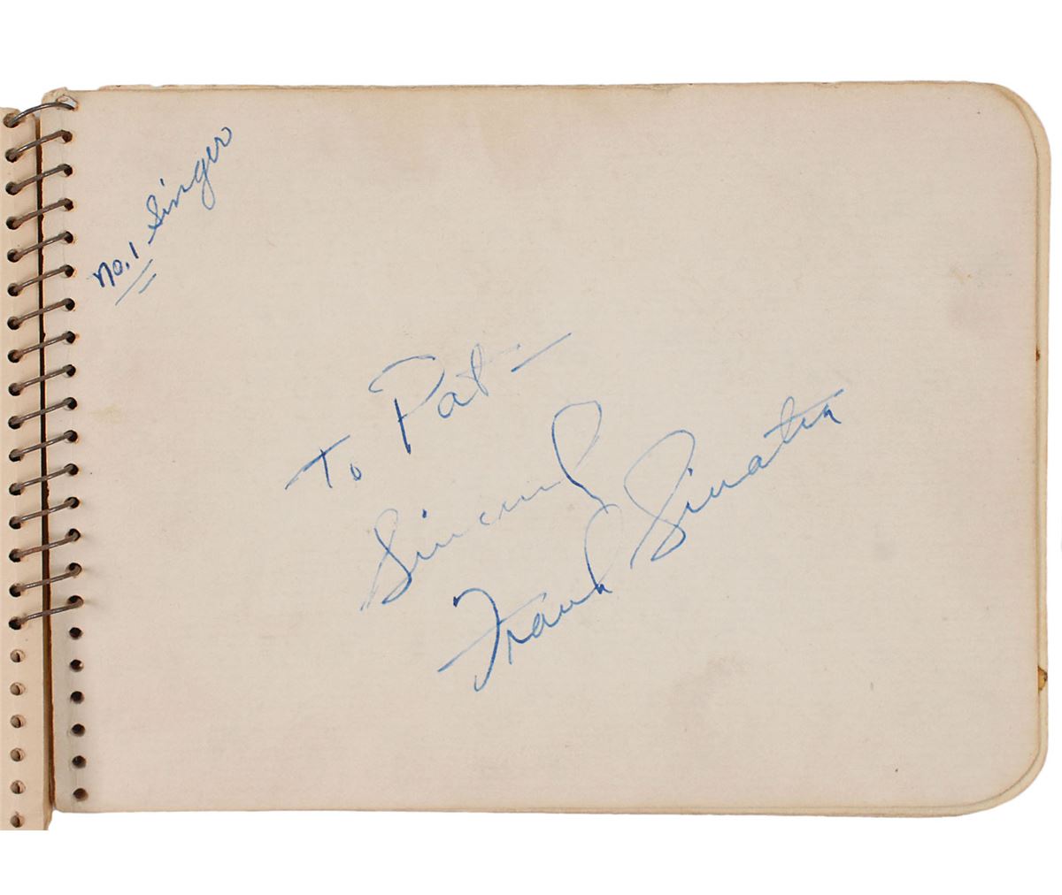 Softcover autograph album, 6 x 4.25, signed inside by more than twenty-five musicians in both ink and pencil, some on affixed slips and many inscribed, including: Frank Sinatra, Buddy Rich, Ziggy Elman, Gene Krupa, the Andrews Sisters, Kay Kyser, Ish Kabibble, and various others. In very good to fine condition, with scattered toning and soiling throughout.