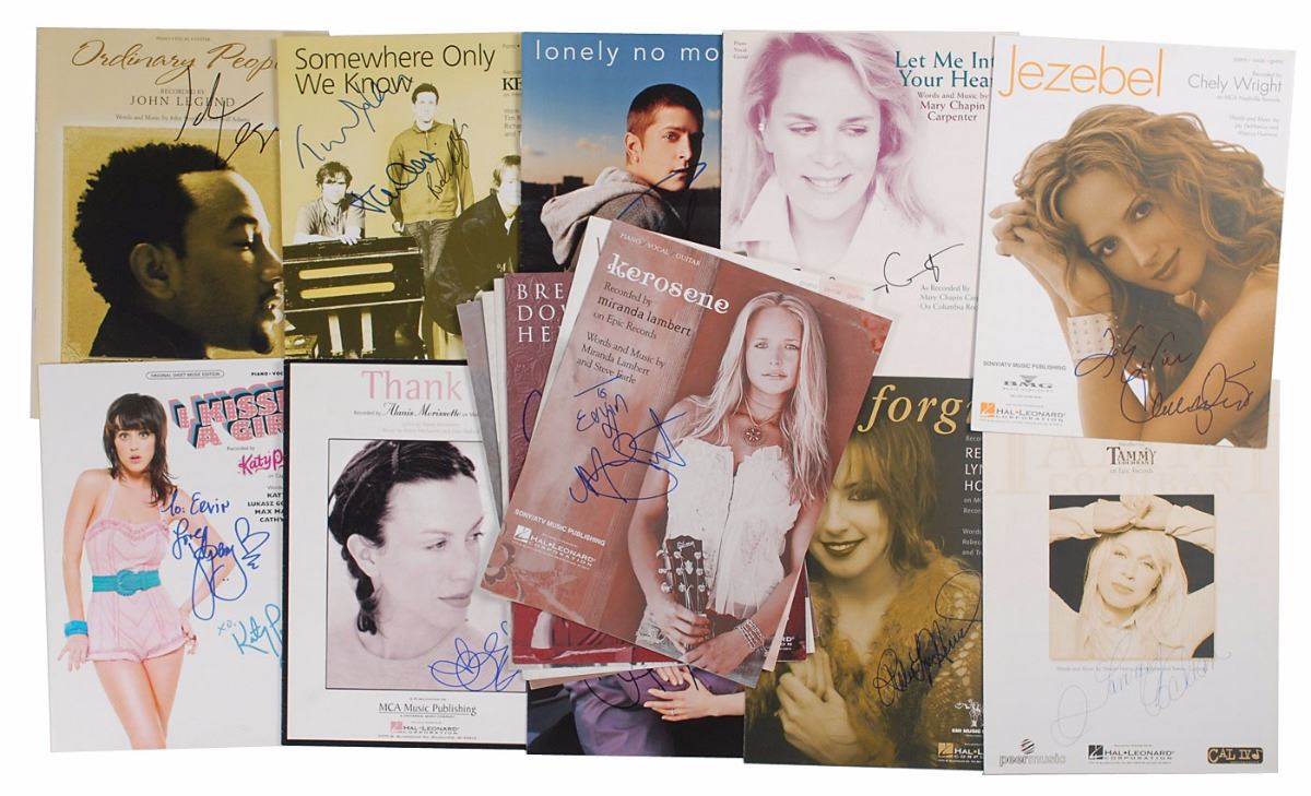 Collection of sixteen sheet music booklets, approximately 9 x 12, each signed in ballpoint or felt tip by the musicians pictured, including: Katy Perry (ins); John Legend; Tim Rice-Oxley, Richard Hughes, and Tom Chaplin of Keane; Alanis Morissette; Rob Thomas; Clint Black; Mary Chapin Carpenter; Rebecca Lynn Howard; Tammy Cochran; Chely Wright (ins); Vince Gill; Miranda Lambert (ins); Jessica Andrews; Julie Roberts; Terri Clark; and Kassidy, Kelsi, and Kristyn Osborn of SHeDaisy. In overall fine condition, with expected handling wear.