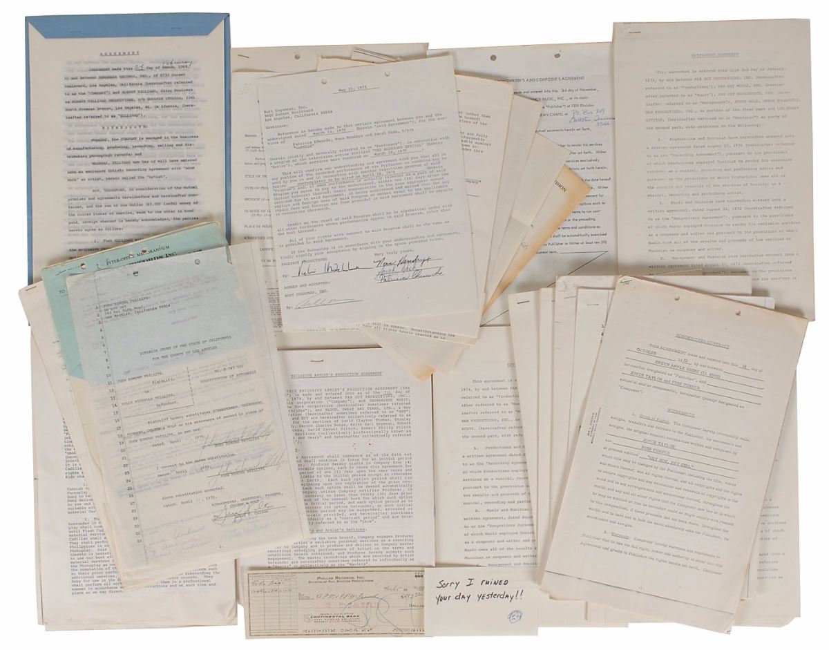 Uncommon assemblage of twenty-six items signed by an array of bands and musicians, consisting mostly of documents. Signers include: Andrews Sisters; Bay City Rollers; Bobby ‘Blue’ Bland; Jean Chapel; Flash Cadillac; Billy Fury; Labelle; Garry Lewis; Mark Lindsay; Roger McGuinn; John Phillips; Gary Puckett; Leon Russell; Brian Short; Phil Spector; Joyce Taylor; Joyce Taylor and Russ Turner; David Clayton Thomas; Adam Wade; War (5); Paul Wheatbread; and James Young (Styx). Short signs his initials at the bottom of each page of the document. In overall fine condition.