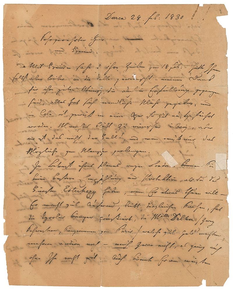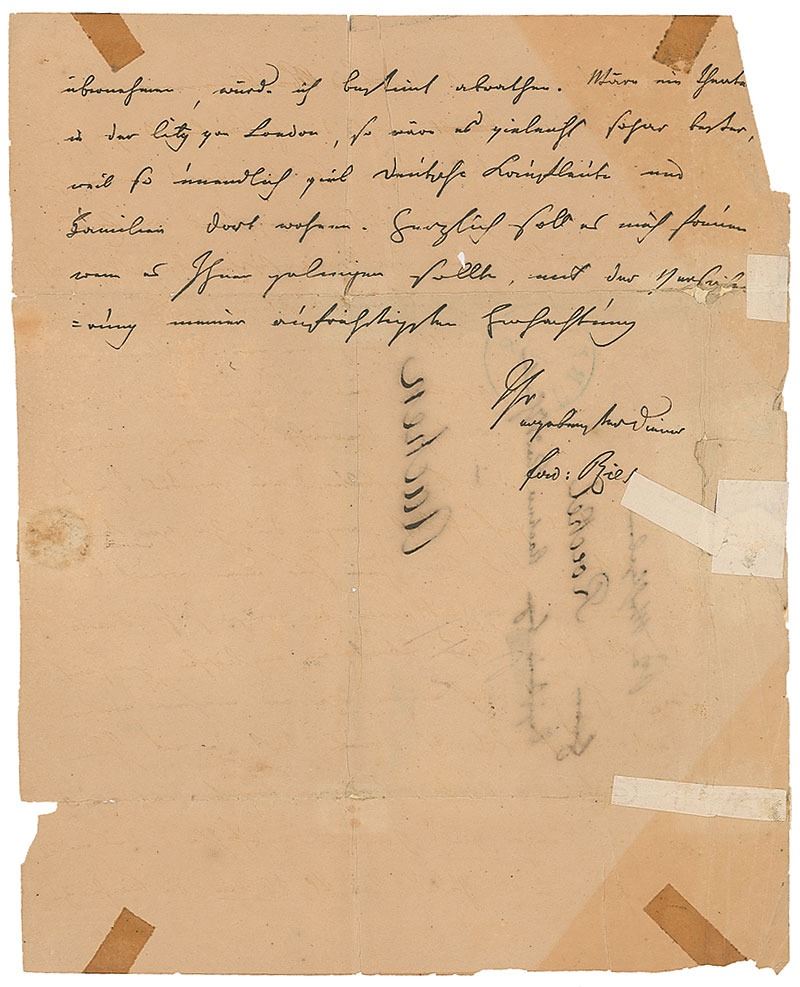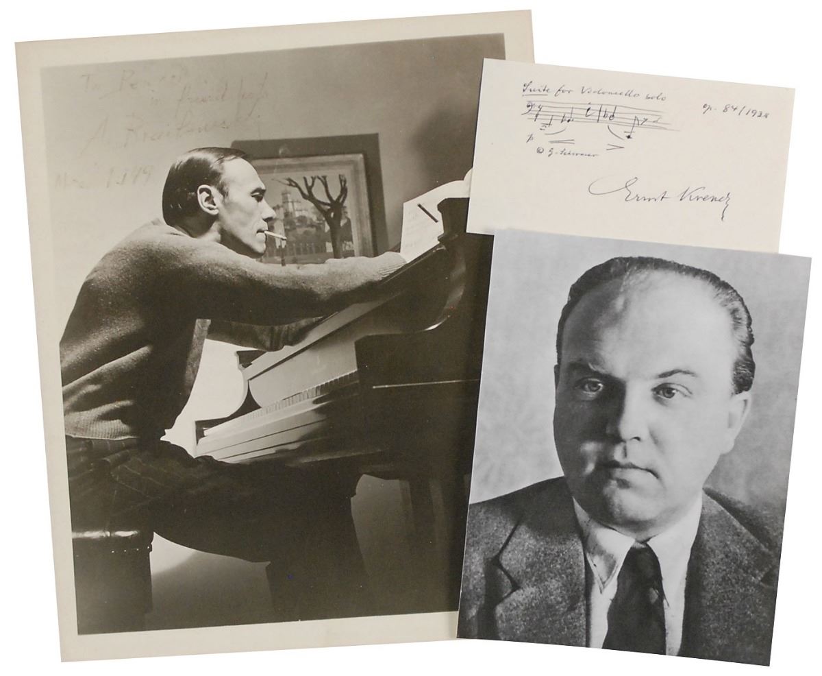 Collection of six items signed by classical musicians or composers, including: Ernst Krenek (AMQS), Jan Kubelik (SP), Agnes Huntington (SP), Alexander Brailowsky (SP), Ferdinand Ries (ALS), and John Sims Reeves (SP). In overall very good to fine condition, with Brailowsky’s signature and inscription quite faded and the Ries letter very fragile with numerous separations.