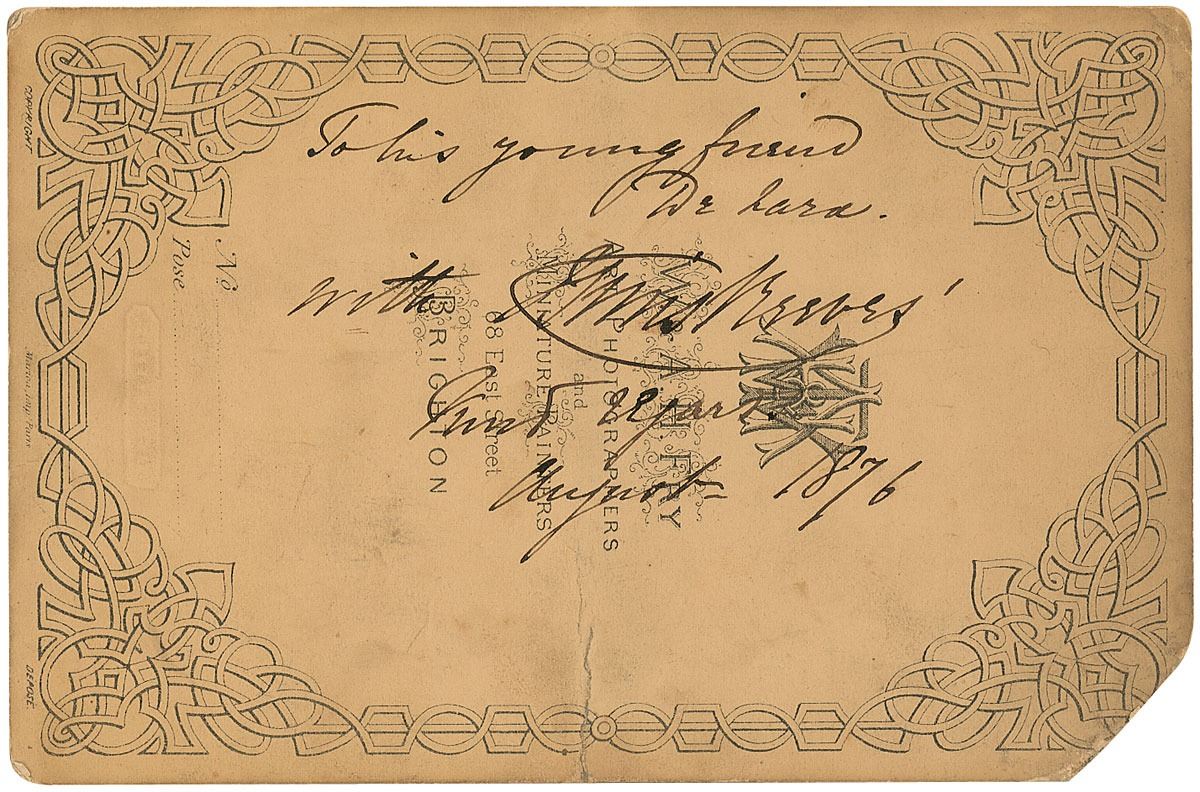 All lots sold by RR Auction are accompanied by an Auction Certificate (“AC”). On any lot presented with an AC issued by RR Auction, the certification is only as to its attribution to the person or entity described or to the lot's usage and only as explicitly stated therein (the “Certification of Authenticity”), to the exclusion of any other warranties, express or implied, including but not limited to those pursuant to the Uniform Commercial Code. The Certification of Authenticity inures only to the original Bidder (as shown in RR Auction's records). Bidder may not transfer, assign, or otherwise convey the Certification of Authenticity, and such purported transfer, assignment, or conveyance shall be null and void. The Certification of Authenticity is valid from date of the Auction in which Bidder was awarded the lot (the “Auction Date”) until five (5) years after the Auction Date, without exception.