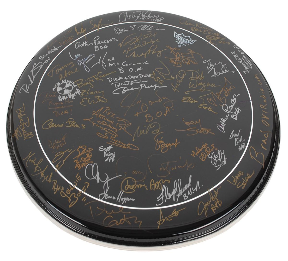 Ebony Remo Weatherking pinstripe bass drum head, 27? in diameter, signed in gold and silver ink by 45 notable players and figures from the music industry, including: Dick Wagner (Alice Cooper); Artimus Pyle (Lynyrd Skynyrd); Gary Lewis; Floyd Sneed (Three Dog Night); Jerry Burgan (We Five); Tommy Heath (Tommy Tutone); Leland Sklar; Harry Elston (The Friends of Distinction); Bebe Buell; Brad Durden, Scott Raines, and Jerry Lyda (Artimus Pyle Band); Billy J. Kramer; George Hughen, Arthur Pearson, Hal McCormick, and Jim Dandy (Black Oak Arkansas); Richie Onori (Sweet); Lance Hoppen and John Hall (Orleans); Mackenzie Phillips (Mamas and the Papas); Carmine Appice, Vinny Martell, and Tim Bogert (Vanilla Fudge); Nick Menza (Megadeth); Jennifer Batten; Elliot Easton (The Cars); Joey and Steffi Scott (Lizzy Borden); Ross the Boss; Max Wasa; David Getz and Peter Albin (Big Brother and the Holding Company); Carrie Stevens (ex-wife of Gene Simmons); Barry Bostwick (The Rocky Horror Picture Show); David Shankle (Manowar); Prescott Niles (The Knack); Dick and Dee Dee Phelps; Tony Valentino (The Standells); Nadir D’Priest (London); Lou Gramm (Foreigner); May Pang; Chris Holmes (W.A.S.P.); Dennis Tufano (The Buckinghams); and Danny Seraphine (Chicago). In fine condition.