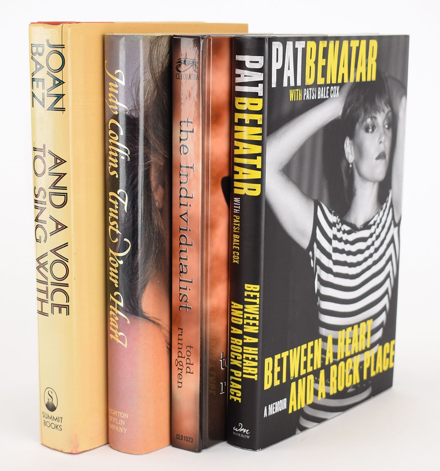 Four hardcover books signed inside in felt tip by musicians, including: Joan Baez (And a Voice to Sing With: A Memoir); Judy Collins (Trust Your Heart: An Autobiography); Pat Benatar (Between a Heart and a Rock Place: A Memoir); and Todd Rundgren (The Individualist). In fine condition.
