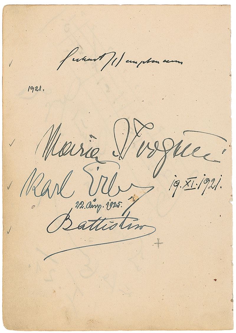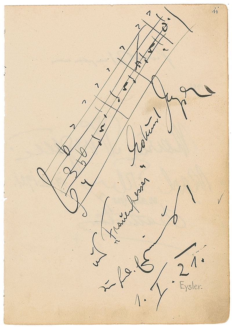 Vintage signatures of four musicians on both sides of a 4.75 x 6.75 album page. Signers are: Edmund Eysler, adding a four-bar AMQS from his operetta 'Der Frauenfresser; soprano Maria Ivogun; tenor Karl Erb; and baritone Mattia Battistini. Page is also signed by Nobel Prize winner Gerhart Hauptmann. In fine condition, with some scattered light toning and soiling.