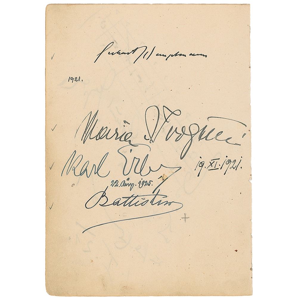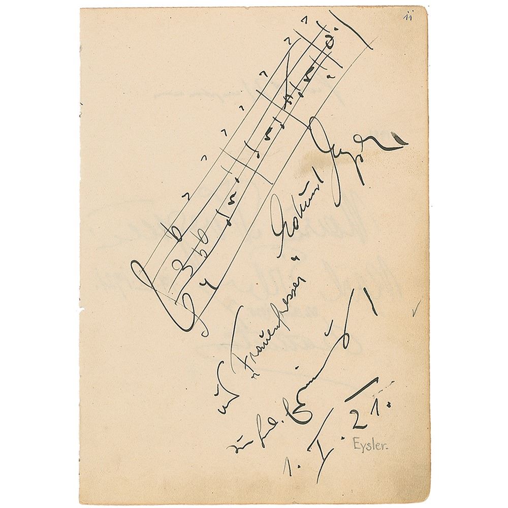 Vintage signatures of four musicians on both sides of a 4.75 x 6.75 album page. Signers are: Edmund Eysler, adding a four-bar AMQS from his operetta 'Der Frauenfresser; soprano Maria Ivogun; tenor Karl Erb; and baritone Mattia Battistini. Page is also signed by Nobel Prize winner Gerhart Hauptmann. In fine condition, with some scattered light toning and soiling.
