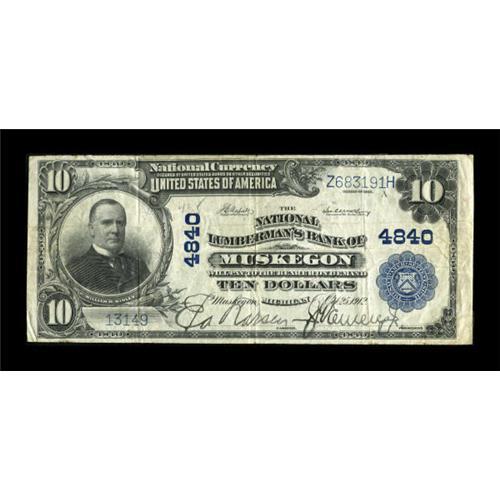 <B>Muskegon, MI</B></I> - $10 1902 Plain Back Fr. 628 <B>The National Lumbermans Bank</B></I> Ch. # 4840<BR> This <B>Very Fine</B></I> note carries strong stamped signatures. The title harks back to the early days of the Michigan timber industry. <BR><BR><b>Shipping:</b> Coins & Currency (<a target="_blank" href="http://www.heritageauctions.com/common/shipping.php">view shipping information</a>)