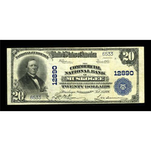 <B>Muskogee, OK</B></I> - $20 1902 Plain Back Fr. 661 <B>The Commercial NB</B></I> Ch. # 12890<BR> While small notes from this bank are quite common, large examples are certainly not, with the population from here standing at fewer than a dozen examples according to Track and Price. This new to the census specimen is as nice or nicer than any of the previously recorded pieces. Sharp <B>Very Fine.</B></I><BR><BR><b>Shipping:</b> Coins & Currency (<a target="_blank" href="http://www.heritageauctions.com/common/shipping.php">view shipping information</a>)