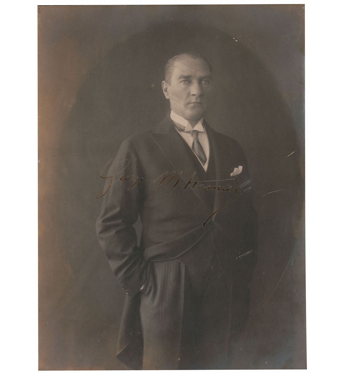 Turkish army officer, statesman, and writer (1881–1938), credited with being the founder of the Republic of Turkey and serving as the country’s first president. Rare matte-finish 6.75 x 9 three-quarter-length portrait of the leader in handsome attire, signed in black ink. Affixed to a cardstock sheet. In very good condition, with scattered surface marks and silvering to dark areas of the image, and some fading, flaking, and fair contrast to ink in the signature. In 1928, Ataturk mandated a transition to a Latin alphabet to replace the Ottoman Turkish script that had been used for over a thousand years. This was one of the most significant cultural changes defined by Ataturk’s reforms, which he put in place in an effort to convert the new Republic of Turkey into a modern, secular state. Ataturk is extremely scarce in any format, with this being a particularly appealing formal pose.