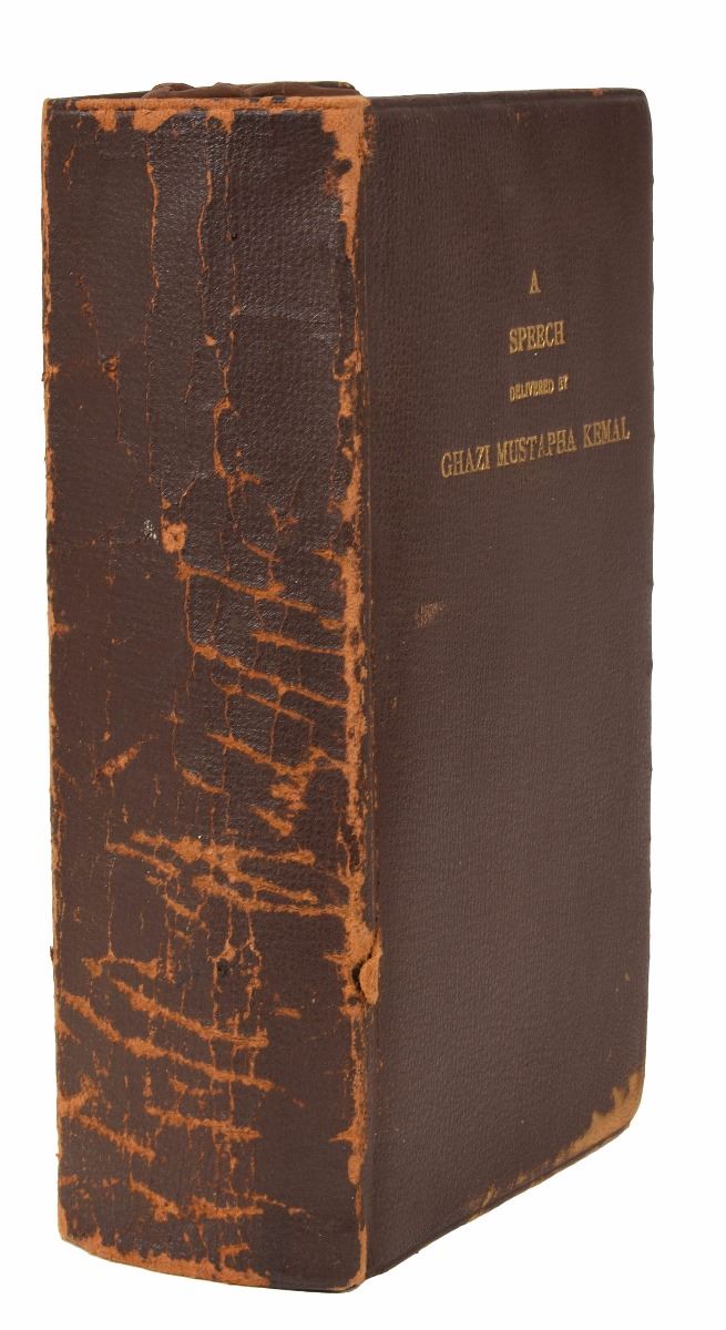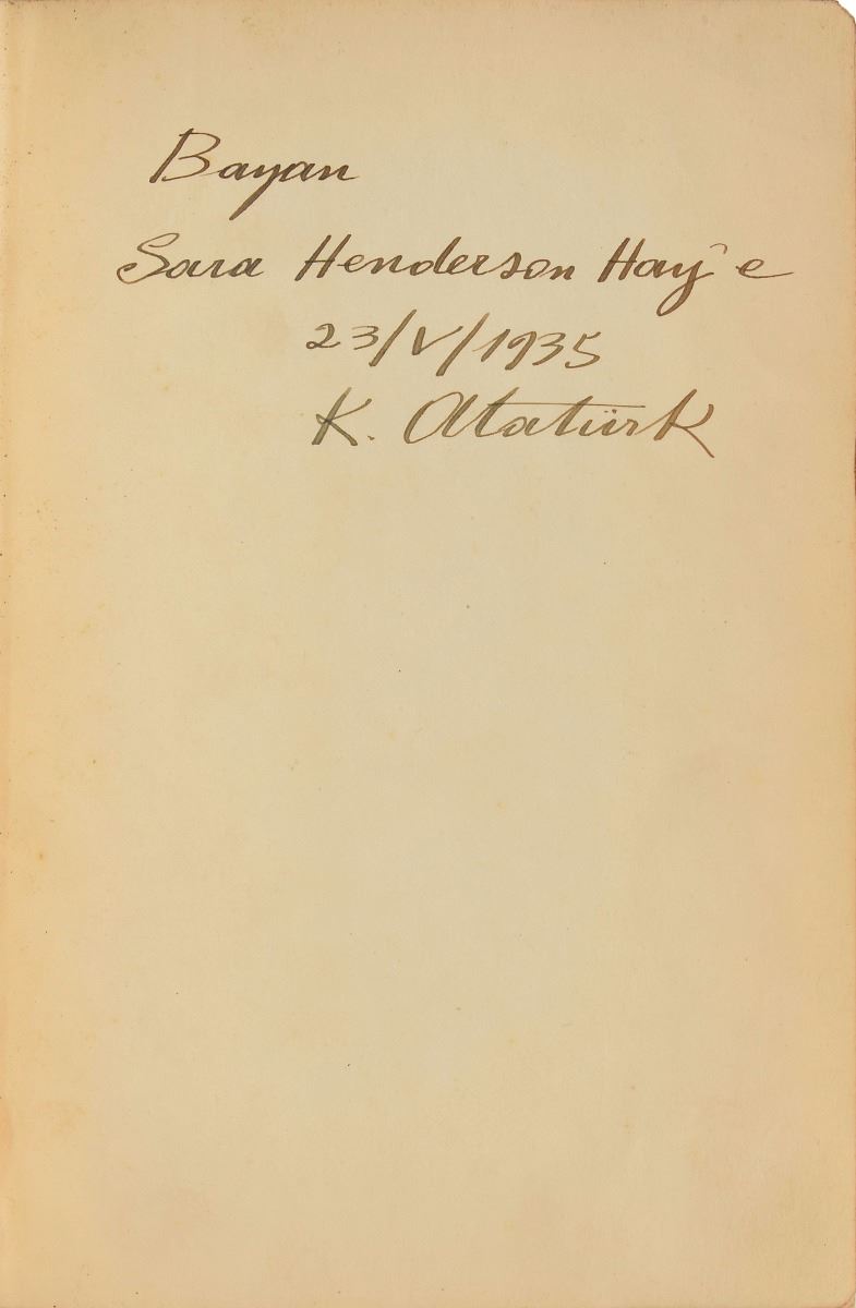 Turkish army officer, statesman, and writer (1881–1938) credited as the founder of the Republic of Turkey. Signed book: A Speech Delivered by Ghazi Mustapha Kemal. Leipzig, Germany: K. F. Koehler Publisher, 1929. Leatherbound hardcover, 6.25 x 8.75, 724 pages. Signed and inscribed on the first free end page in black ink, "Bayan, Sara Henderson Hay'e, 23/V/1935, K. Ataturk." Autographic condition: fine. Book condition: VG-/None, with edgewear, cracked and flaking leather at spine, and frontispiece detached but present. Accompanied by six unsigned period postcard photos, three of which picture Ataturk with other military officers; the other three are of the Prinkipo Yacht Club on the island of Buyukada. This is an especially scarce variation of his signature, as he became known as 'Atakturk'—meaning 'Father of the Turks'—only later in life. Ataturk remains especially scarce across all formats, with this being the first signed book we have offered.