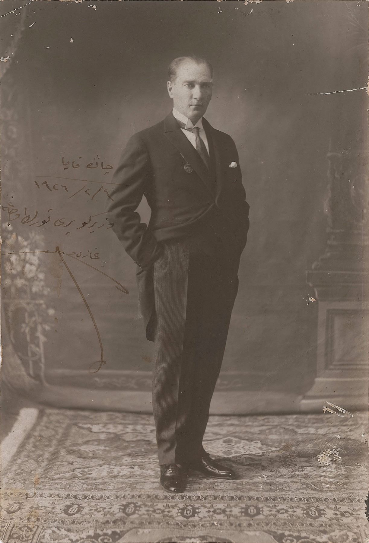 Turkish army officer, statesman, and writer (1881–1938) credited as the founder of the Republic of Turkey. Exceptional matte-finish 5.75 x 8.5 full-length portrait of Ataturk in formal attire, signed and inscribed in ink to the Gankaya Vezirkopru Turkish Power Society. In very good to fine condition, with trimmed edges, some scratching and flecks of missing emulsion, and a tear to the upper right edge. A highly appealing inscribed photograph of the heroic Turkish reformer, whose autograph remains rare across all formats.