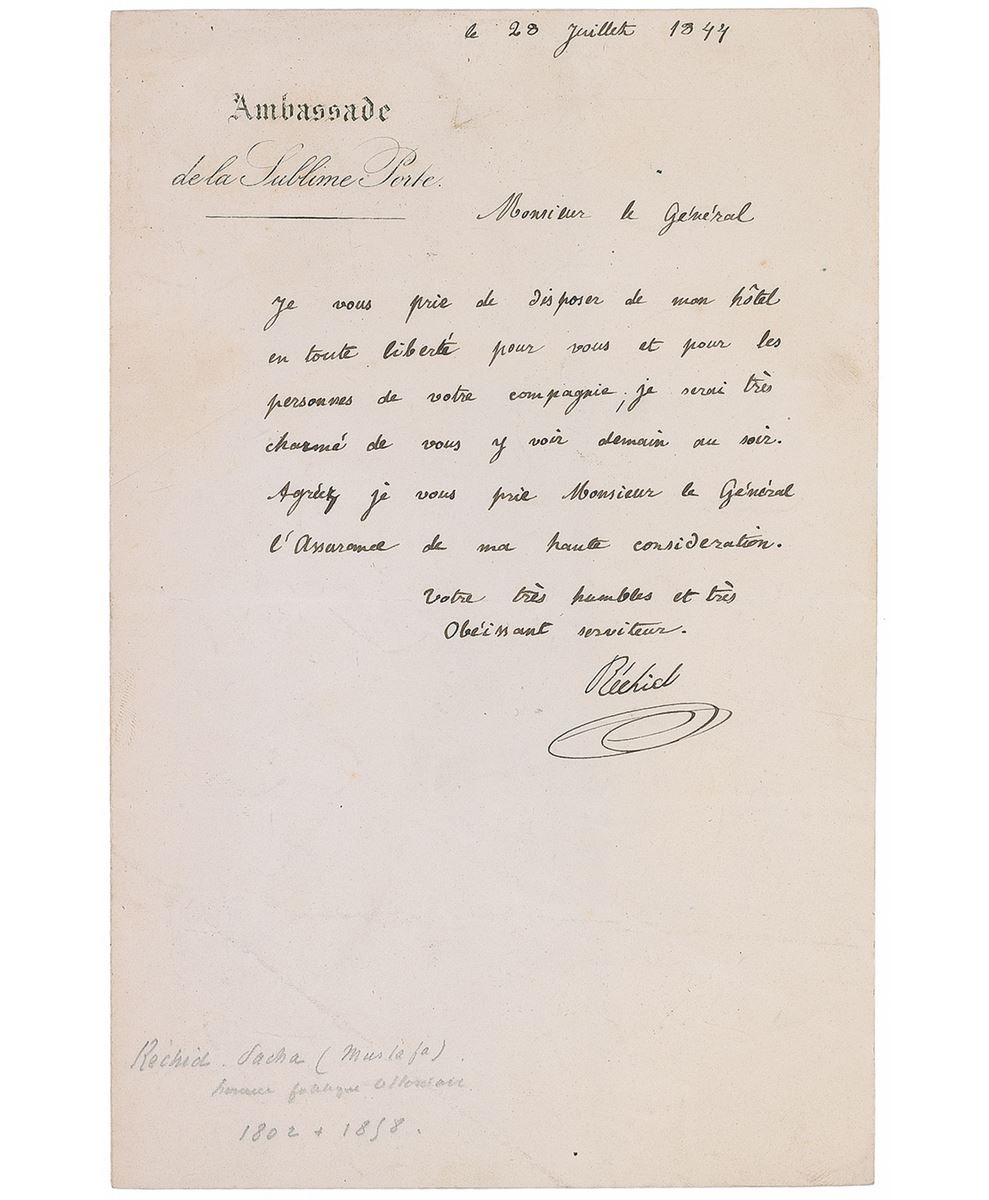 Ottoman statesman and diplomat, known best as the chief architect behind the Ottoman government reforms known as Tanzimat (1779–1858). Rare LS in French, one page, 5.25 x 8.25, Ambassade de la Sublime Porte letterhead, July 28, 1844. Untranslated. In fine condition, with scattered creases and light soiling.