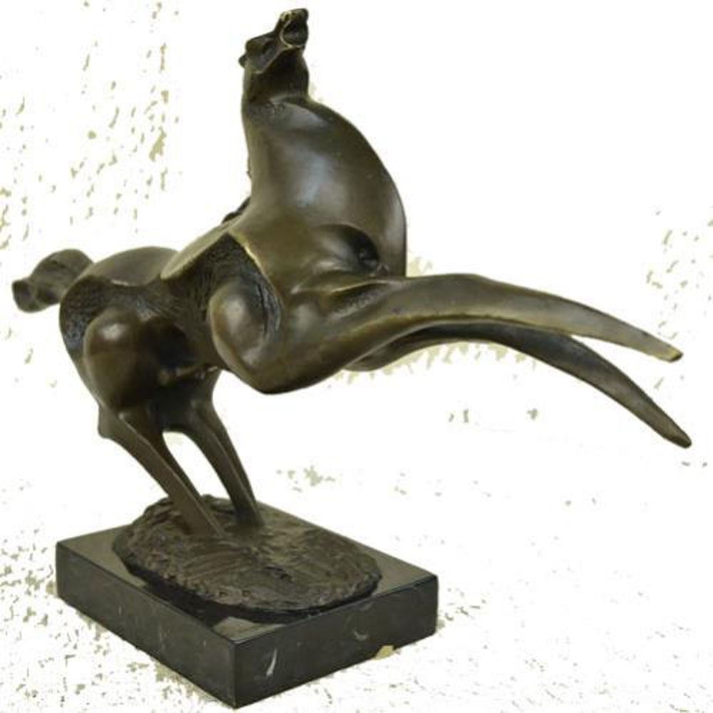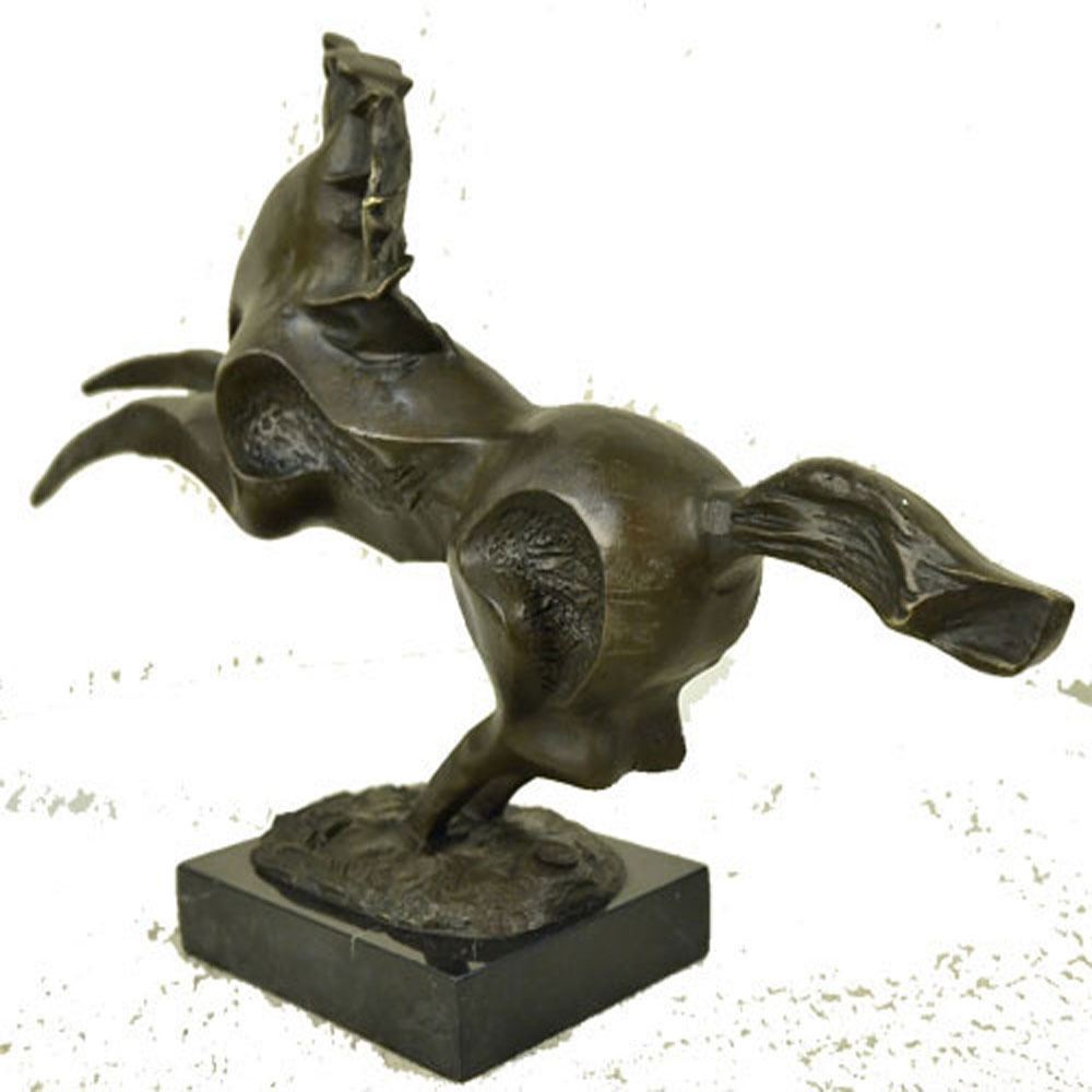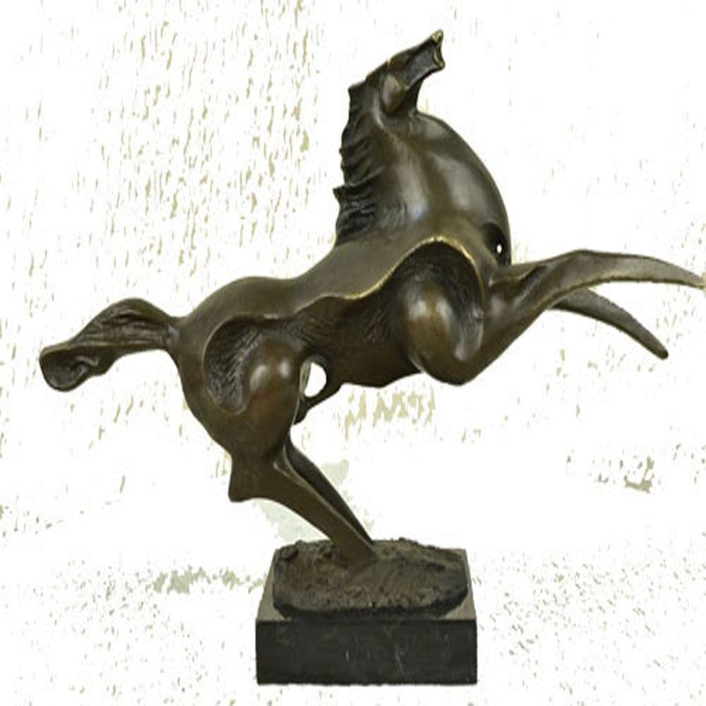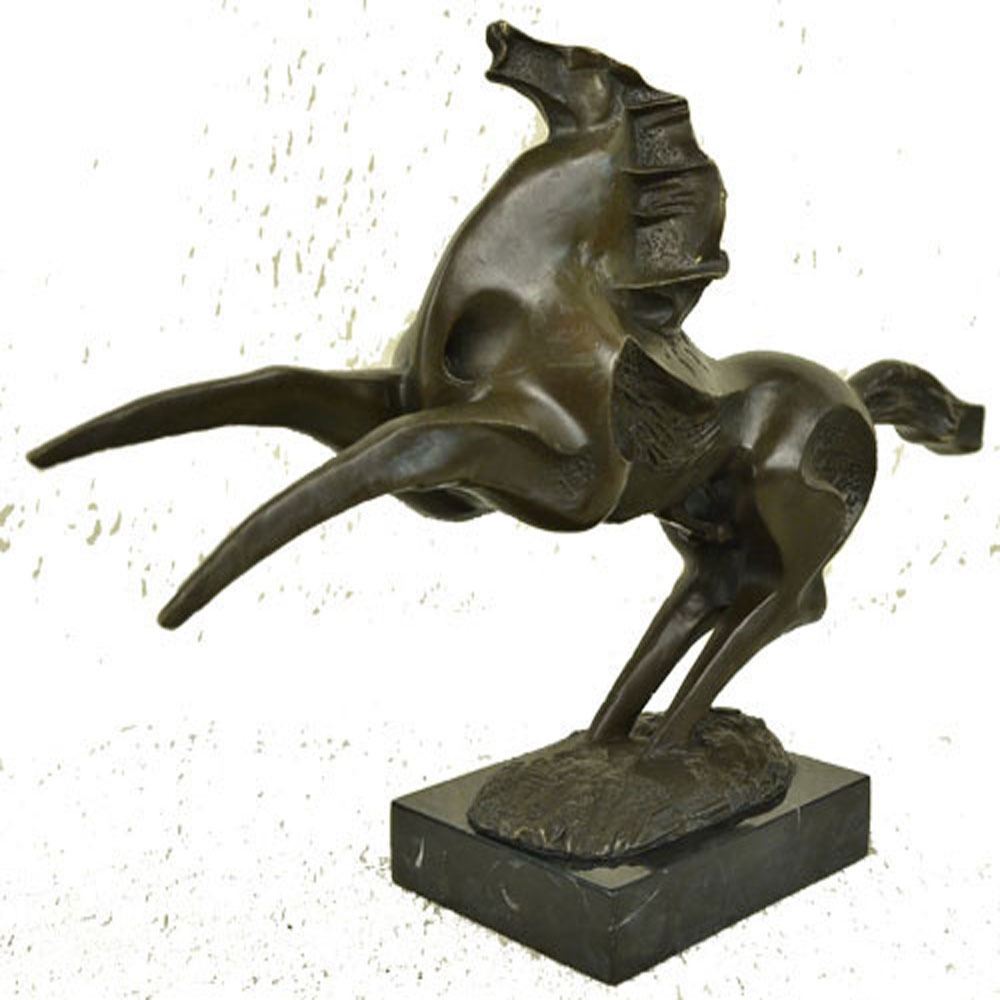 This abstract and modern horse gallops into the wind and rears up letting out a wild neigh as the wind seems to push against him with a mighty force. This abstract horse captures raw emotions from the artist and the nature of the wild beast that lie sin himself. His mane, although not defined, captures the pure energy of movement and shows the force and energy and creativity that is behind this Sculpture. His body has fine linear lines that protrude from his side giving him a unique yet desirable look for the abstract theme. His hind legs mesh in to the base creating the support for the Sculpture. This Sculpture was cast using the Lost Wax Method and has a dark brown patina. Bronze Dimensions with Marble Base: Height 11 X Width 20 inches. Weight: 13 LBS.