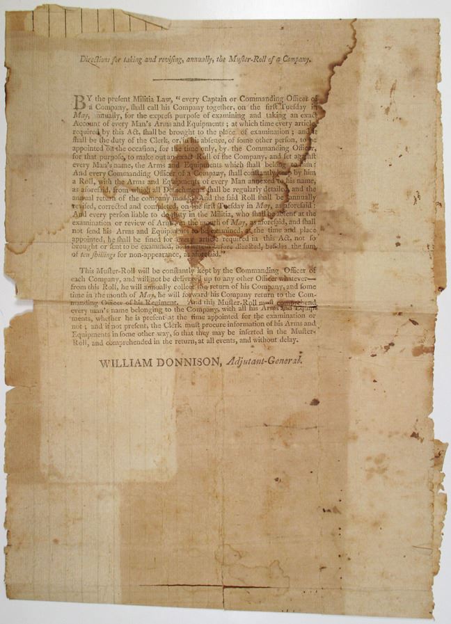 Massachusetts. 1802, Military document with very detailed Muster-Roll instructions on front, black text, with William Donnison, Adjutant-General at bottom. William Donnison (1754-1834) was an American soldier for the Massachusetts Militia for more than 10 years. Donnison fought in the Revolutionary War and was the aide to Massachusetts Governor Hancock in 1786 before becoming Adjutant General in 1788. He served in the role of Adjutant General until 1813. On the back of the document is a handwritten Muster-Roll of an 1802 Foot Company, with the names and ranks of enlisted soldiers, some print is faint and difficult to read. Piece is in Fragile condition with significant damage and staining. Interestingly, a split at the bottom has been stitched back together and repaired with thread. Unusual piece related to early American military history.
