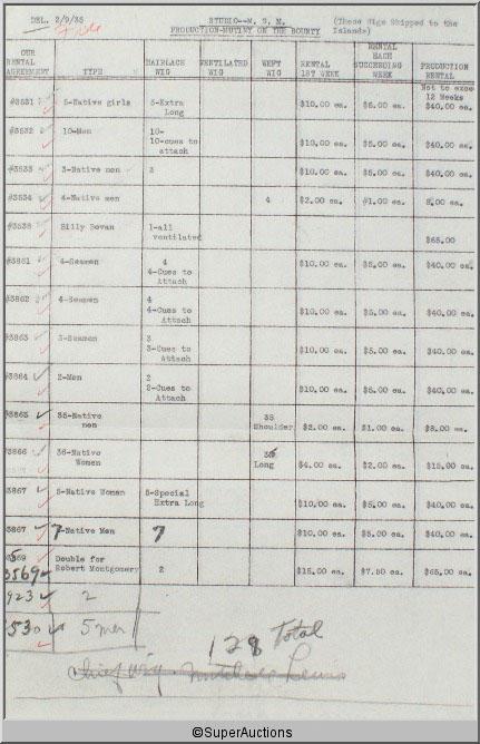 From the Max Factor Files / "Mutiny On The Bounty" / Released 1936 in Germany / MGM Studios / "Fletcher Christian successfully leads a revolt against the ruthless Captain Bligh on the HMS Bounty" / Starring: Charles Laughton, Clark Gable, Frachot Tone, Movita, Donald Chrisp, Herbert Mundin and Dudley Diggs / Folder contains Wig rental register dated February 2, 1935 {Max Factor Collection}