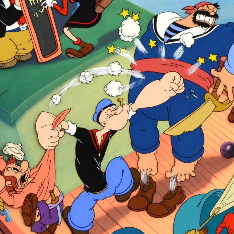 "Mutiny" is a limited edition hand inked and hand painted animation cel with background, numbered and hand signed by Myron Waldman (1908-2006). Includes Certificate of Authenticity! Measures approx. 18" x 24" (background), 11" x 15" (cel).