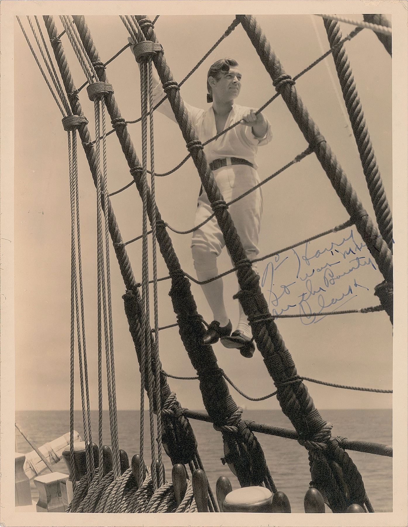 Tremendous vintage matte-finish 10 x 13 full-length photo of Gable as Fletcher Christian from the 1935 film Mutiny on the Bounty, signed and inscribed in fountain pen, "To Harry, It was 'Mutiny on the Bounty,' Clark.” Reverse bears a William Grimes/MGM credit stamp. In fine to very fine condition. After being lent to Columbia Pictures and winning the Best Actor Oscar for his role in Frank Capra's It Happened One Night, Gable returned to MGM as perhaps Hollywood's biggest draw. Mutiny on the Bounty received rave reviews upon release and earned both Gable and costar Charles Laughton nominations for Best Actor. For the second straight year, Gable played lead in a film that would receive the Oscar for Best Picture. Gable remains scarce in signed photos from Mutiny on the Bounty, with this example enhanced furthermore by its uncommon size and fantastic inscription.