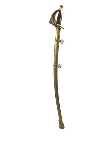 Mutiny on the Bounty (1962) -Calvary sabre prop swords. Gold sheath is made of wrapped leather with two belt loop rings. Hilt is made of resin painted gold with a brown leather grip and gold detail. (measures 42" long)This incredible memorabilia comes direct from the Debbie Reynold's archive collection. Debbie Reynolds and Todd Fisher purchased and acquired this amazing collection decades ago from the MGM auction, 20th Century Props auctions, Christie's auctions, Planet Hollywood and numerous additional auctions. Debbie Reynolds then opened Hollywood Central Props where many of these props and costumes were used in the making of feature films and television shows. This auction also marks the beginning of a long-term collaboration with The Debbie Reynolds’ Archives and her son Todd Fisher with a collection of props, costumes and photos including an ensemble from CHOCOLAT, ROMEO AND JULIET, MISSISSIPPI, V FOR VENDETTA, THE PATRIOT, THE LAST SAMURAI and more!