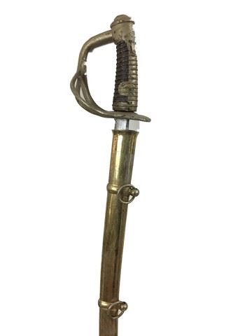 Mutiny on the Bounty (1962) -Calvary sabre prop sword. Gold sheath is made of metal with two belt loop rings. Blade is made of metal wrapped with leather painted silver. Hilt is made of metal painted gold with a black leather grip and gold detail. (measures 42" long)