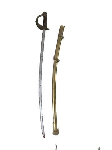 Mutiny on the Bounty (1962) -Calvary sabre prop sword. Gold sheath is made of metal with two belt loop rings. Blade is made of metal wrapped with leather painted silver. Hilt is made of metal painted gold with a black leather grip and gold detail. (measures 42" long)