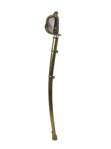 Mutiny on the Bounty (1962) -Calvary sabre prop sword. Gold sheath is made of metal with two belt loop rings. Blade is made of metal wrapped with leather painted silver. Hilt is made of metal painted gold with a black leather grip and gold detail. (measures 42" long)