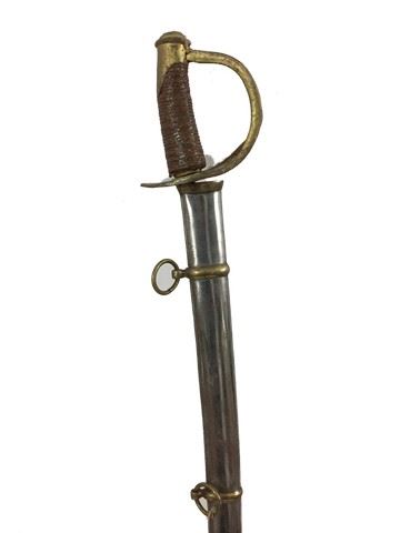 Mutiny on the Bounty (1962) -Calvary saber prop sword. Rusted silver sheath with gold tip detail made of metal with gold metal belt loop rings. Blade is metal. Hilt is made of metal painted gold with a brown grip. (measures 42" long)